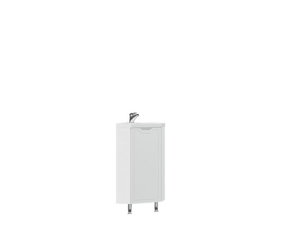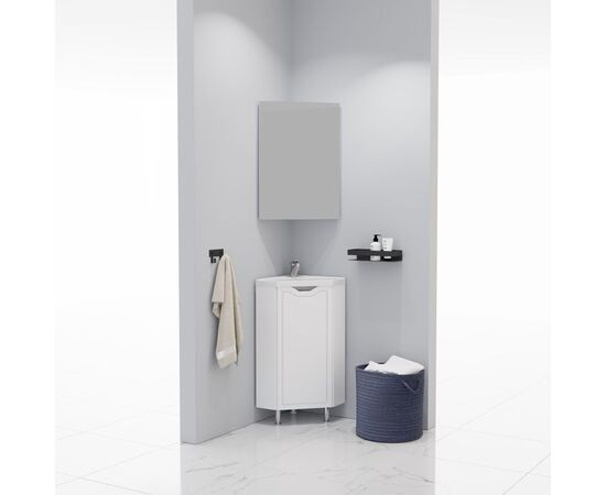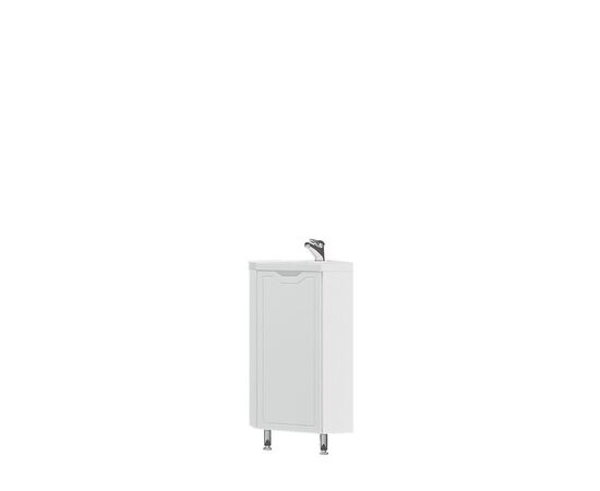 Коллекция мебели для ванных комнат МИРРА - подходящий вариант для тех, кто предпочитает легкое, гармоничное пространство, полное спокойствия и умиротворения. Данная коллекция позволит рационально использовать угловое пространство в ванной комнате. Тумба угловая, оснащена одной распашной створкой, позади дно. Тумба стоит на 2 металлических опорах и 1 пластиковой. Корпус ЛДСП белый, фасады МДФ в белой плёнке ПВХ. Корпус мебели выполнен в цвете «Белый глянец». Ручки на фасадах отсутствуют, вместо них предусмотрены интегрированные ручки и декоративная фрезеровка по периметру фасада. Бесшумность и длительный цикл эксплуатации обеспечивают петли с доводчиком.