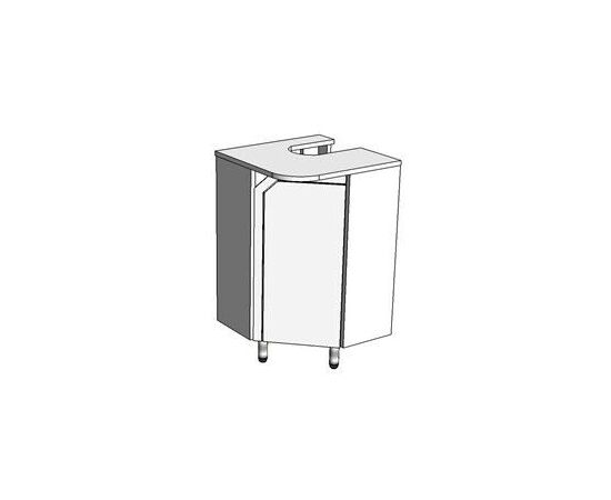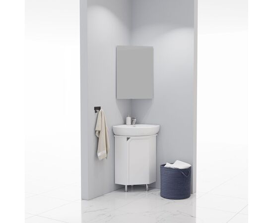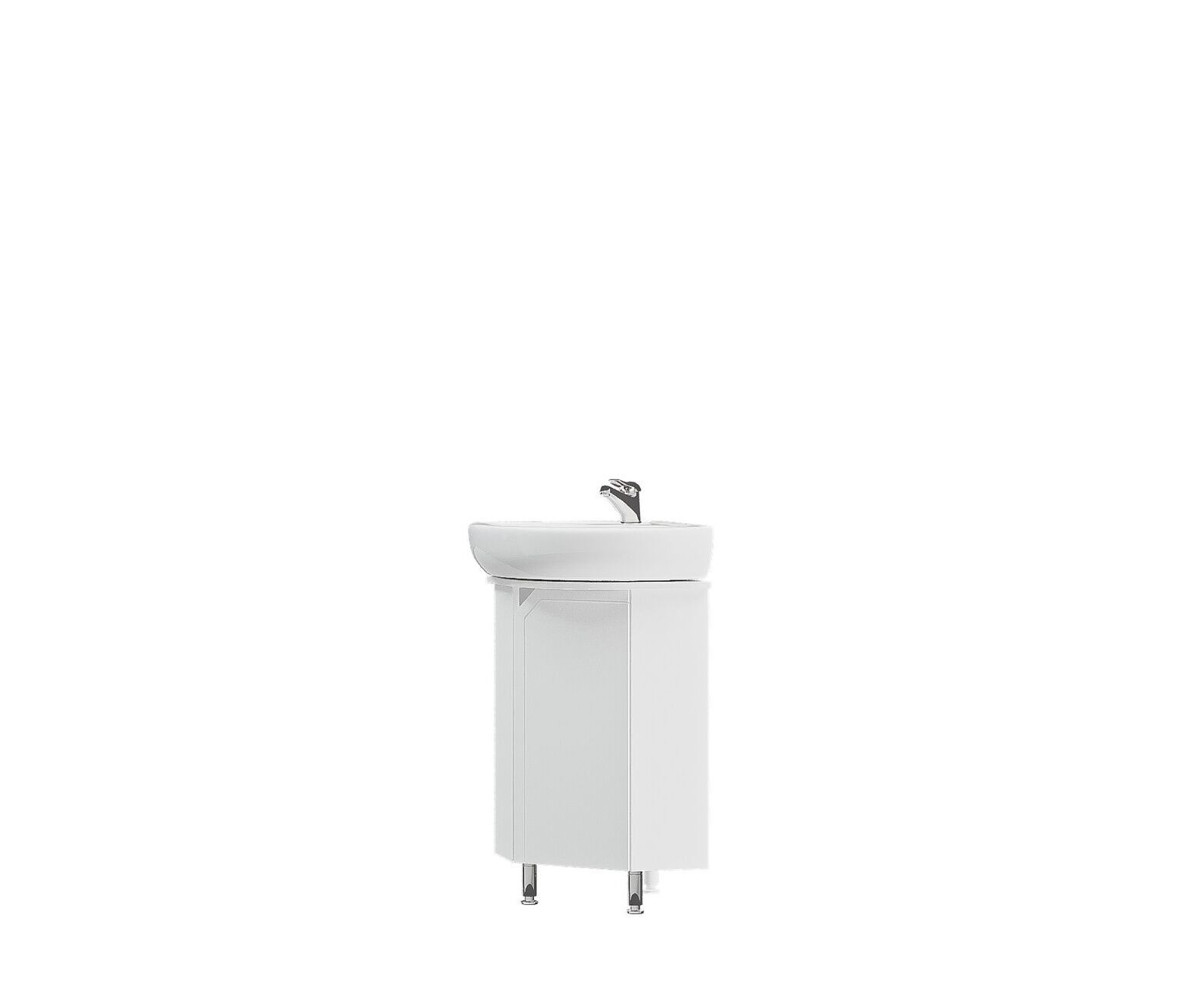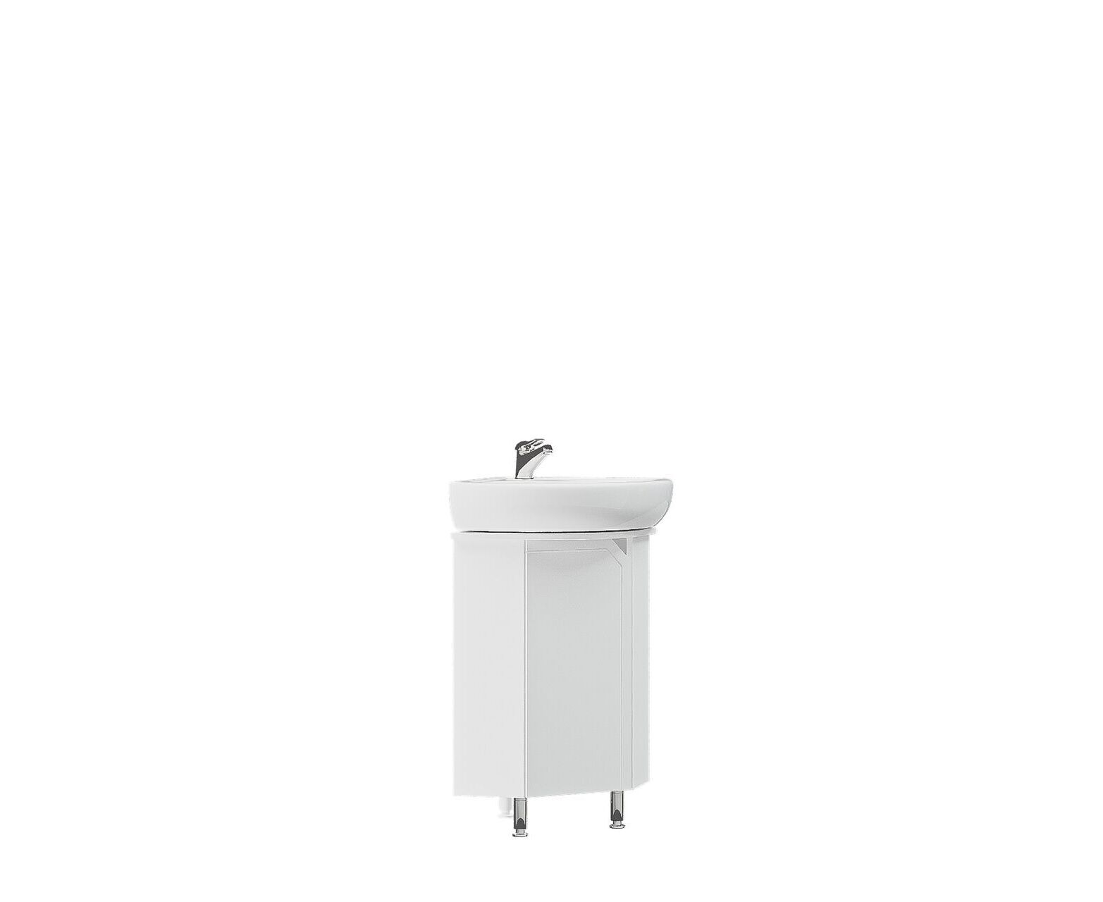 Функциональность и эргономика эксплуатации - отличительные черты коллекции мебели для ванных комнат СИРИУС. Тумба угловая, имеет 1 распашную дверь, позади дно. Сверху крышка с вырезом под раковину. Тумба стоит на 2 металлических опорах и 1 пластиковой. Корпус ЛДСП белый, фасады МДФ в белой плёнке ПВХ. Фурнитура с лицевой стороны фасадов отсутствует, вместо нее предусмотрены интегрированные ручки в виде эргономичной фрезеровки под 45 градусов, которую обрамляет декоративная фрезеровка по периметру фасада. Бесшумность и длительный цикл эксплуатации обеспечивают петли с доводчиком.
