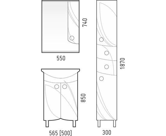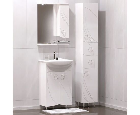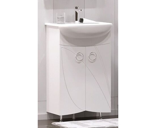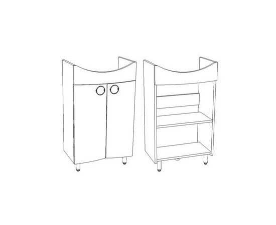 Тумба оснащена двумя распашными дверцами и одной полочкой за ними. У тумбы 2 металлические опоры спереди, сзади - 1 пластиковая. Двери и коромысло - МДФ в плёнке ПВХ, корпус - ЛДСП.