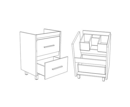 У тумбы 2 выдвижных ящика. Высота ящиков 170 мм, верхний ящик разделен пополам. Тумба стоит на 4 металлических опорах. Боковины выполнены из ЛДСП 26 мм толщиной.
