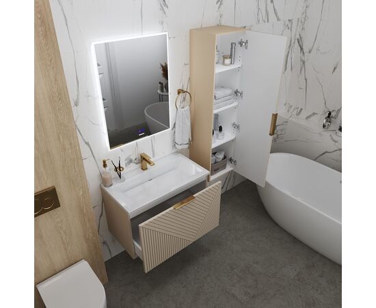 Устойчивость к влаге: материалы, используемые в тумбе, обеспечивают повышенную влагостойкость, что особенно важно для использования в ванной комнате. Покрытие защищает от разбухания и деформации при попадании воды.