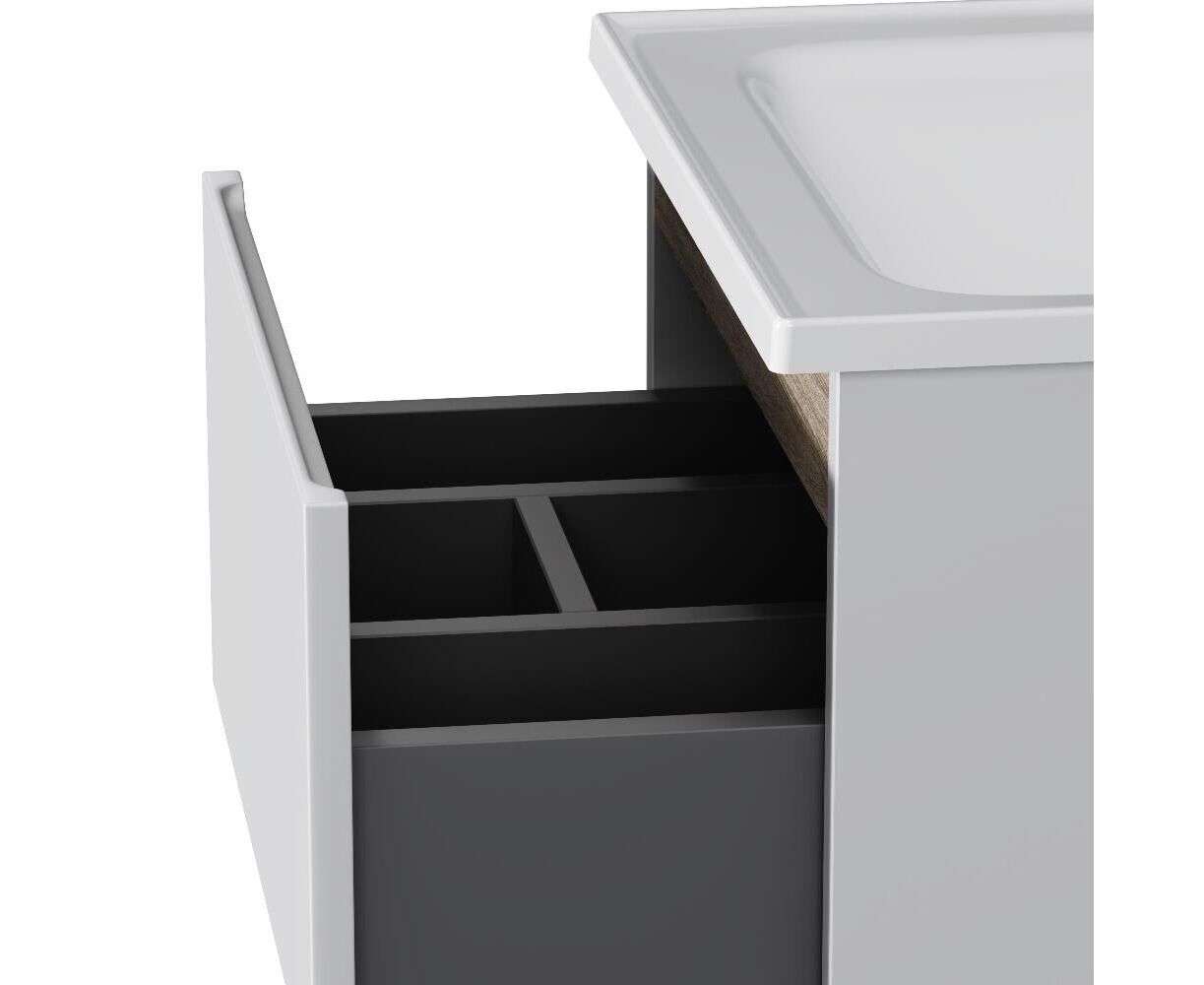 Подвесная тумба бренда AM.PM коллекции X-Joy с белыми глянцевыми фасадами, дополненными отделкой под светлое дерево. Функциональный органайзер в первом ящике позволит хранить необходимые косметические средства под рукой и в полном порядке. Внутреннее покрытие каждого ящика выполнено в современном цвете "антрацит" и имеет противоскользящее покрытие. Материал и покрытие корпуса - влагостойкий ЛДСП. Материал фасада - МДФ. Покрытие фасада - высококачественные итальянские краски и эмали.
