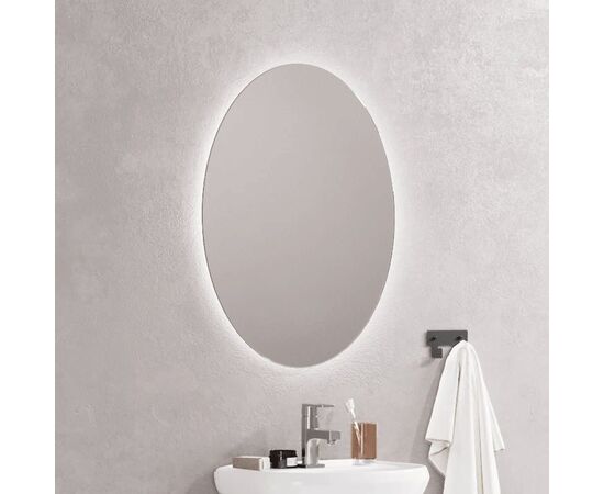 Зеркало "Овал 57" представляет собой зеркальное полотно с амальгамой на основе серебра, оснащенное светодиодной лентой. Лента крепится к высококачественному ПВХ профилю с обратной стороны зеркала и выдает на стену мягкий рассеянный свет, за счет чего создается притягательный "парящий" эффект. У зеркала внешняя LED- подсветка. Защита от пыли и защита от царапин; предусмотрена защитная пленка сзади. Все электрические компоненты находятся в специальном пластиковом коробе из ABC пластика. Степень защиты IP20. Температура цвета 6000 К, цвет освещения – белый. Количество светодиодов: 120 шт/м. Толщина стекла 4 мм, а основания - 26 мм. Тип цоколя: два контактных штыря. Предусмотрена возможность интеграции в сеть умного дома. Питание осуществляется через шнур длиной 1,5 м с вилкой в сеть 220 В, выключатель - механическая кнопка включения.