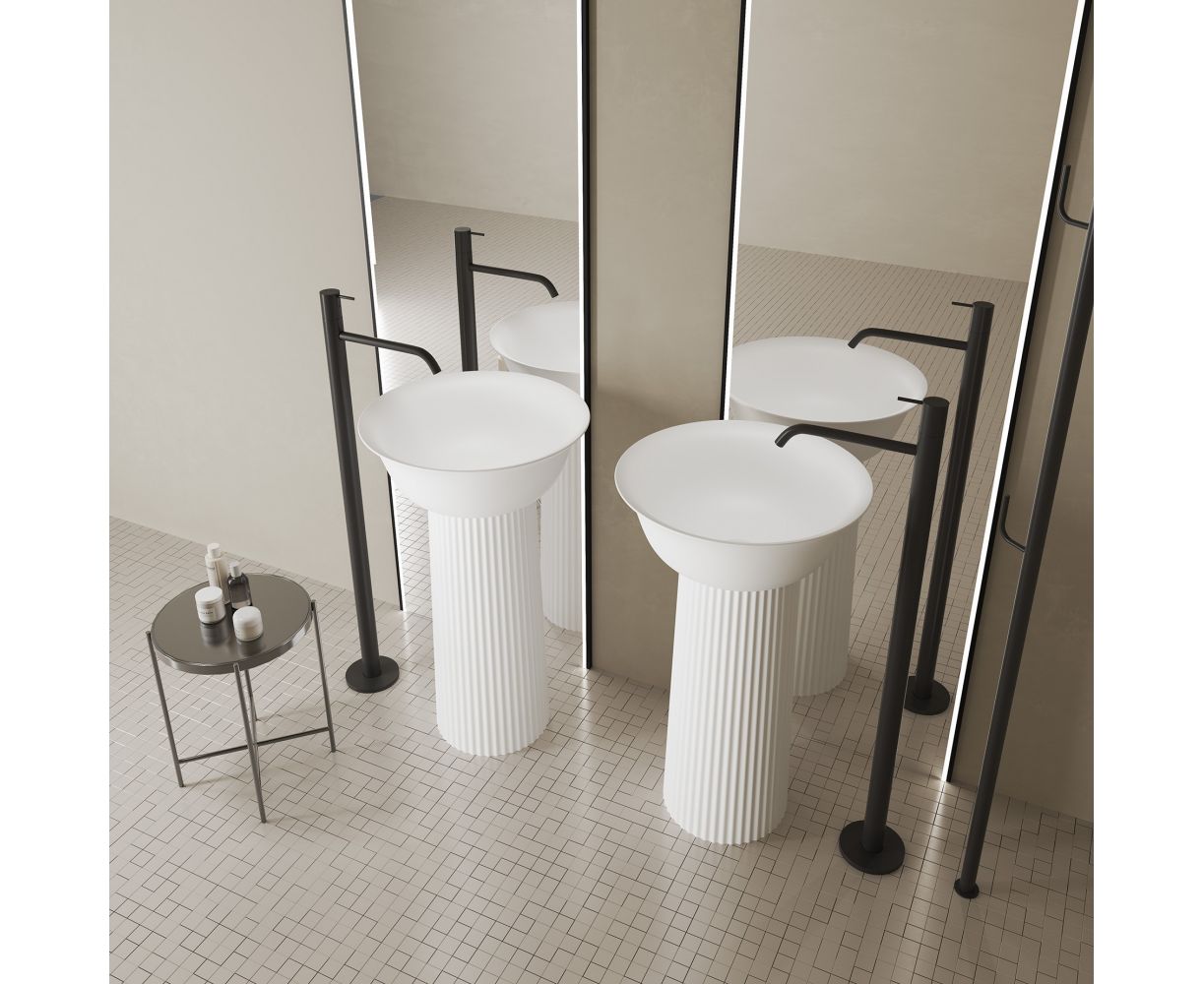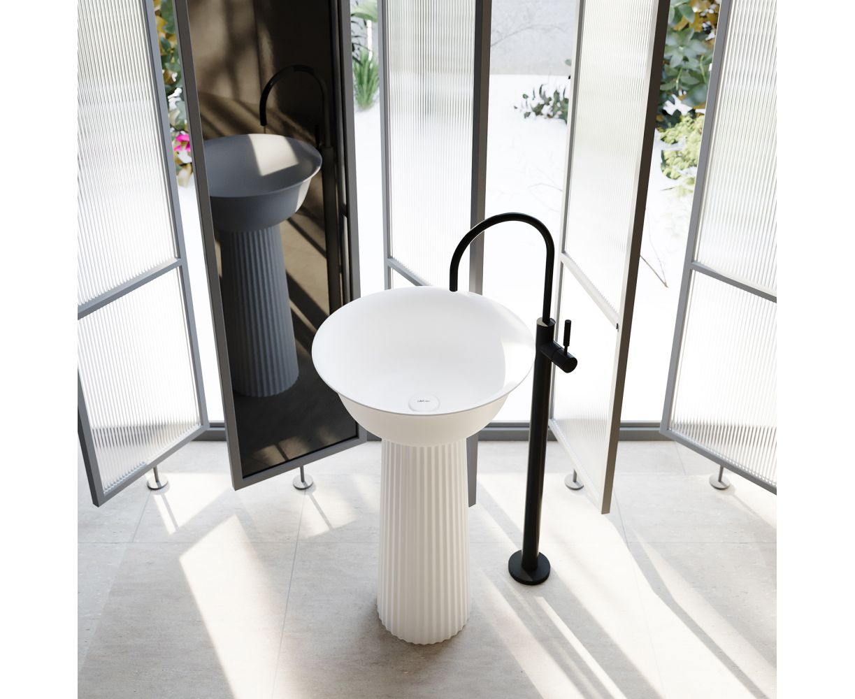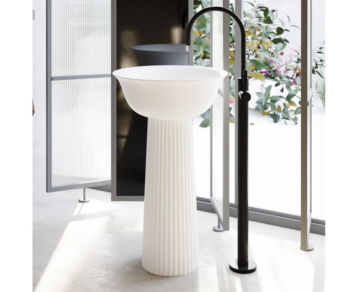 Форма: круглая. Материал: санфарфор. Цвет: белый матовый. Установка: отдельностоящая. Донный клапан: в комплекте.