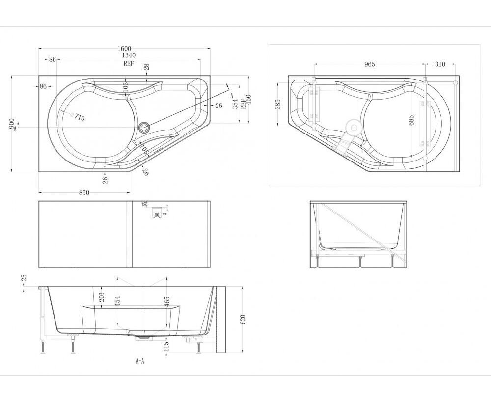 Модификация: левосторонняя. Установка: пристенная. Форма: угловая асимметричная. Материал: акрил. Цвет: белый. Объем, л: 340. Антискользящее покрытие: нет.