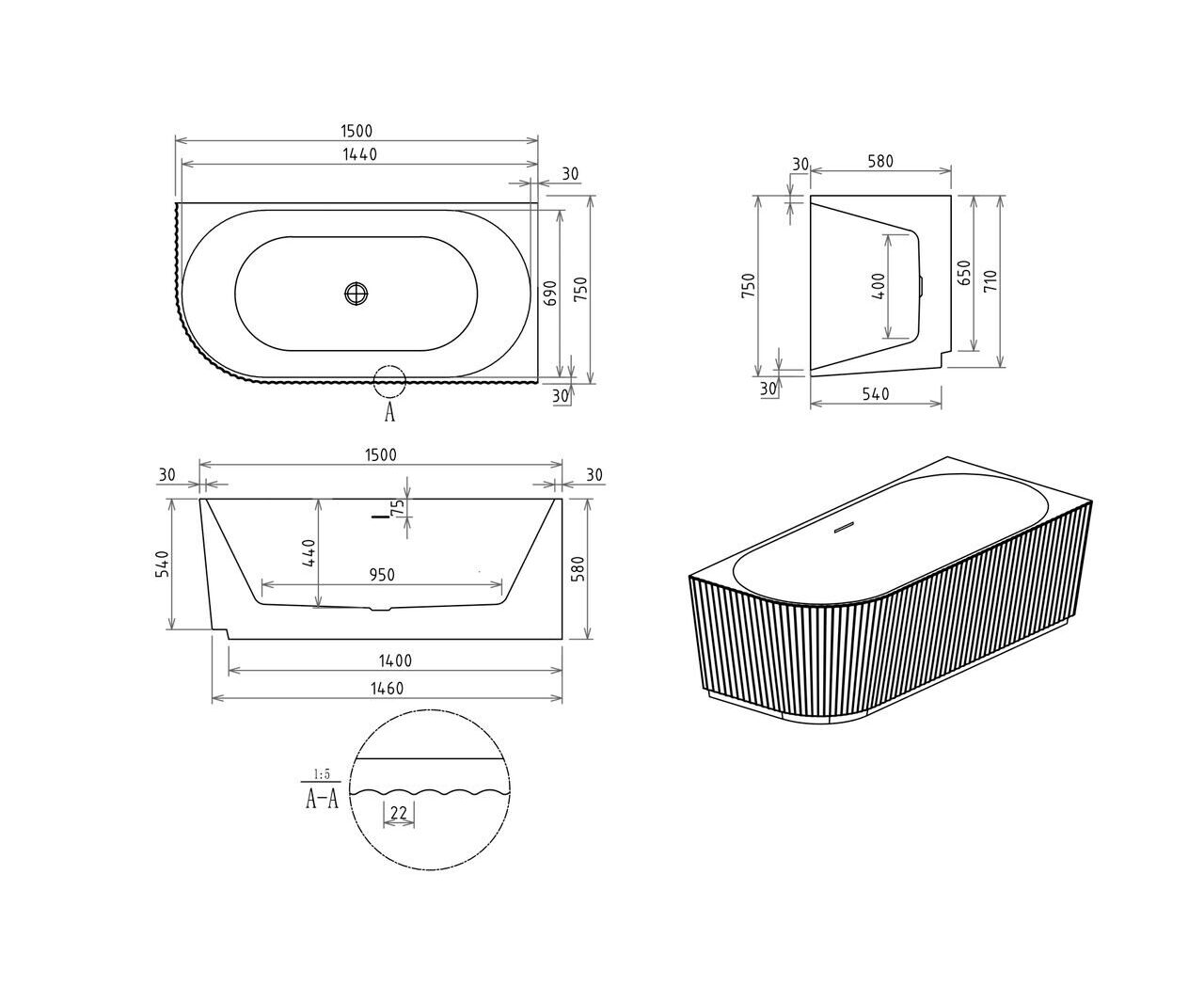 Форма: асимметричная. Длина: 170 см. Ширина: 78 см. Толщина листа: 0,5 см. Антискользящее покрытие: нет. Расположение перелива: по центру. Ручки: нет, установка не предусмотрена. Монтаж: пристенно-угловая.