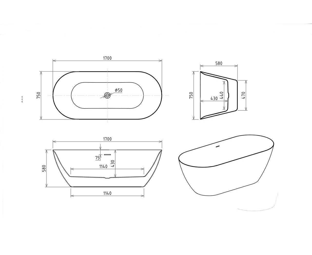 Форма: овальная. Длина: 170 см. Ширина: 75 см. Толщина листа: 0,5 см. Антискользящее покрытие: нет. Расположение перелива: по центру. Ручки: нет, установка не предусмотрена. Монтаж: отдельностоящая.