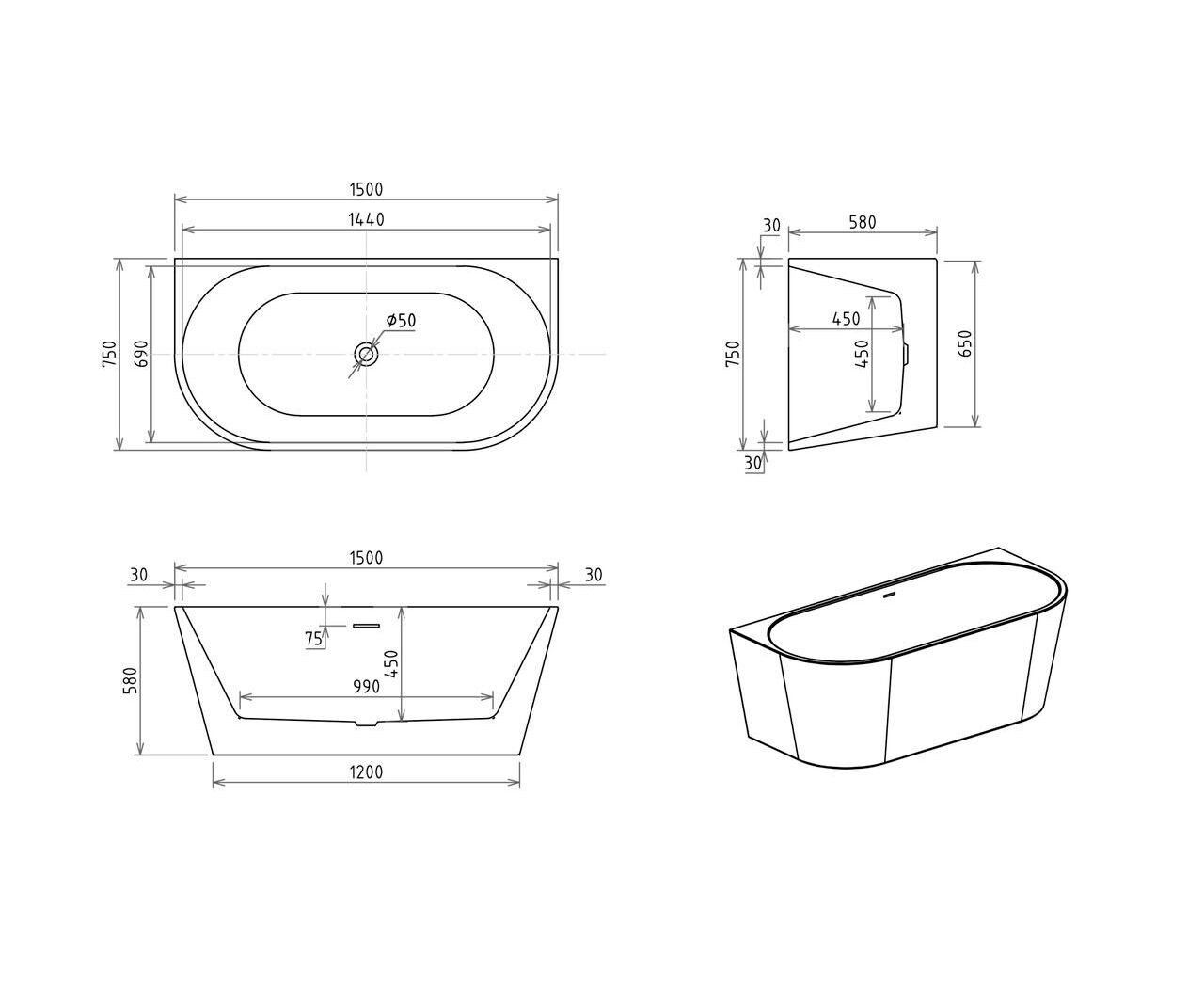 Форма: прямоугольная. Длина: 150 см. Ширина: 75 см. Толщина листа: 0,5 см. Антискользящее покрытие: нет. Расположение перелива: по центру. Ручки: нет, установка не предусмотрена. Монтаж: пристенная.