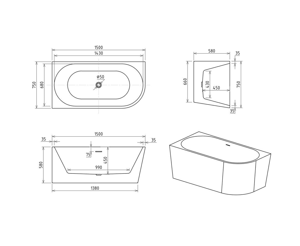 Форма: асимметричная. Длина: 150 см. Ширина: 75 см. Толщина листа: 0,5 см. Антискользящее покрытие: нет. Расположение перелива: по центру. Ручки: нет, установка не предусмотрена. Монтаж: пристенно-угловая.