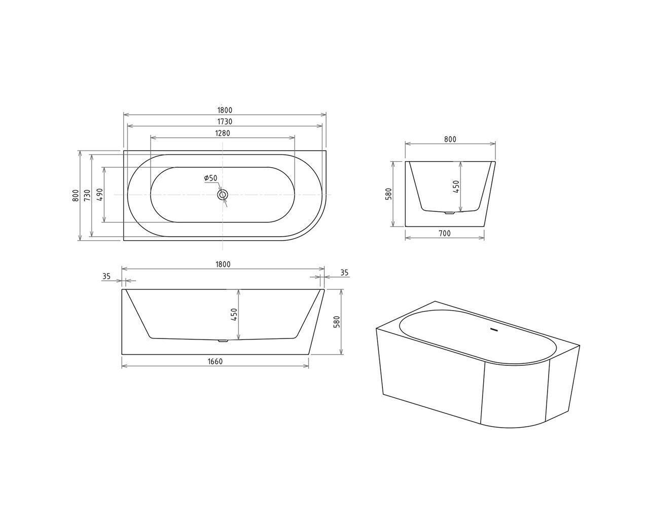Форма: асимметричная. Длина: 180 см. Ширина: 80 см. Толщина листа: 0,5 см. Антискользящее покрытие: нет. Расположение перелива: по центру. Ручки: нет, установка не предусмотрена. Монтаж: пристенно-угловая.