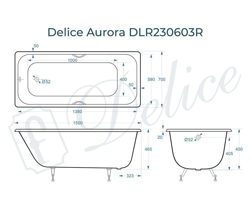 Для установки используются фирменные ножки Delice, которые имеют надежное и прочное крепление, обеспечивают высокую устойчивость ванны и регулируются по высоте. Высота на ножках варьируется от 60 до 65 см. Ножки выполнены из высокопрочного чугуна марки СЧ25, который выдерживает большие нагрузки. Для модели Aurora подходит свой комплект ножек - артикул DLR000012.