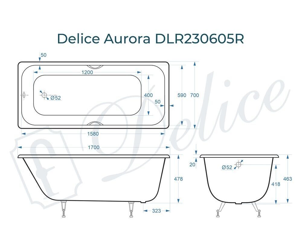 Для установки используются фирменные ножки Delice, которые имеют надежное и прочное крепление, обеспечивают высокую устойчивость ванны и регулируются по высоте. Высота на ножках варьируется от 60.8 до 65.8 см. Ножки выполнены из высокопрочного чугуна марки СЧ25, который выдерживает большие нагрузки. Для модели Aurora подходит свой комплект ножек - артикул DLR000012.