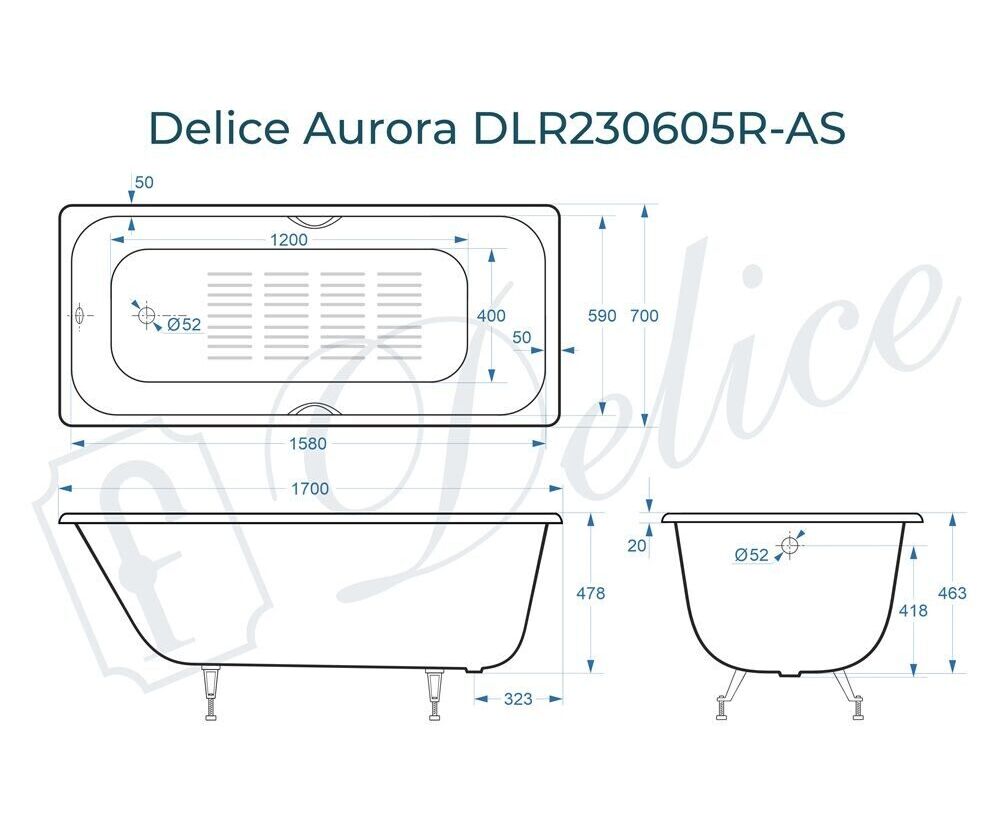 Для установки используются фирменные ножки Delice, которые имеют надежное и прочное крепление, обеспечивают высокую устойчивость ванны и регулируются по высоте. Высота на ножках варьируется от 60.8 до 65.8 см. Ножки выполнены из высокопрочного чугуна марки СЧ25, который выдерживает большие нагрузки. Для модели Aurora подходит свой комплект ножек - артикул DLR000012.