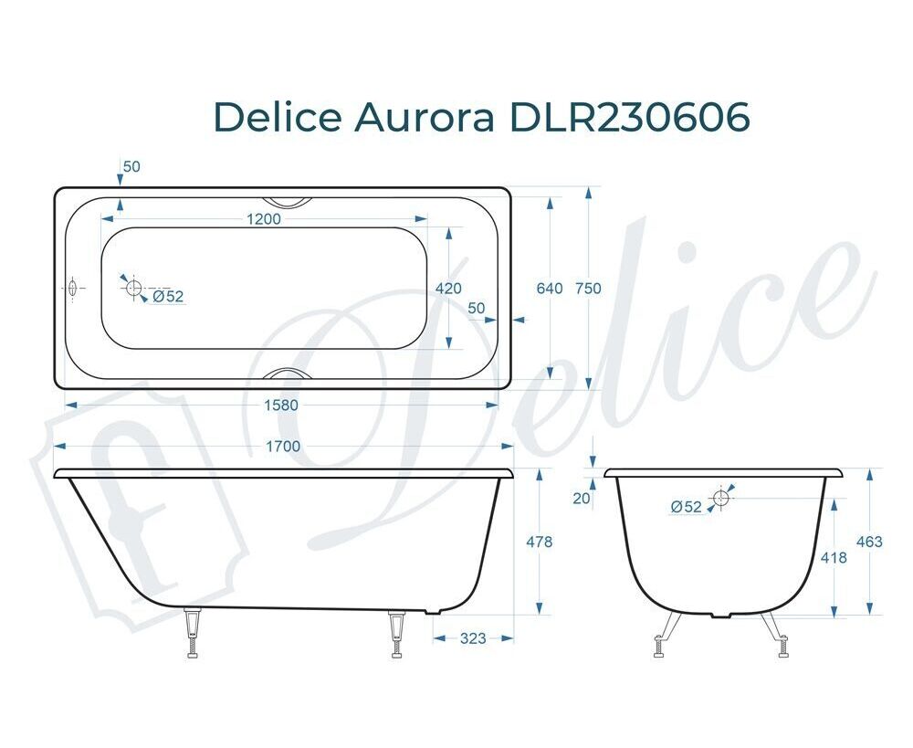 Для установки используются фирменные ножки Delice, которые имеют надежное и прочное крепление, обеспечивают высокую устойчивость ванны и регулируются по высоте. Высота на ножках варьируется от 60.8 до 65.8 см. Ножки выполнены из высокопрочного чугуна марки СЧ25, который выдерживает большие нагрузки. Для модели Aurora подходит свой комплект ножек - артикул DLR000012.