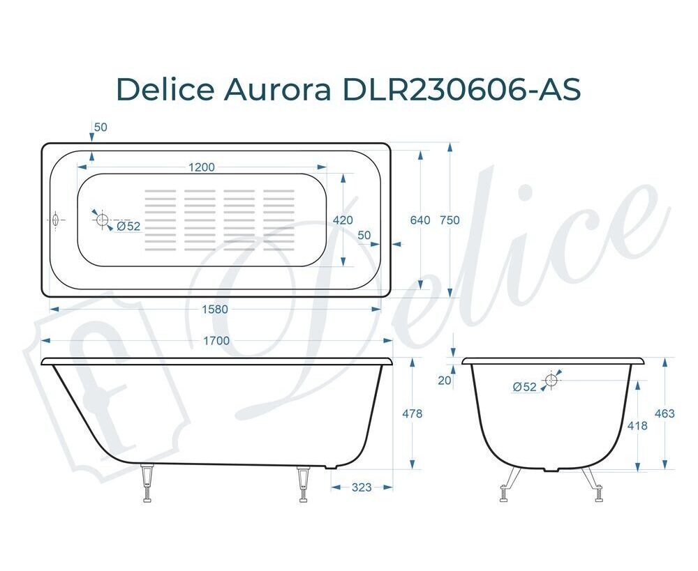 Для установки используются фирменные ножки Delice, которые имеют надежное и прочное крепление, обеспечивают высокую устойчивость ванны и регулируются по высоте. Высота на ножках варьируется от 60.8 до 65.8 см. Ножки выполнены из высокопрочного чугуна марки СЧ25, который выдерживает большие нагрузки. Для модели Aurora подходит свой комплект ножек - артикул DLR000012.
