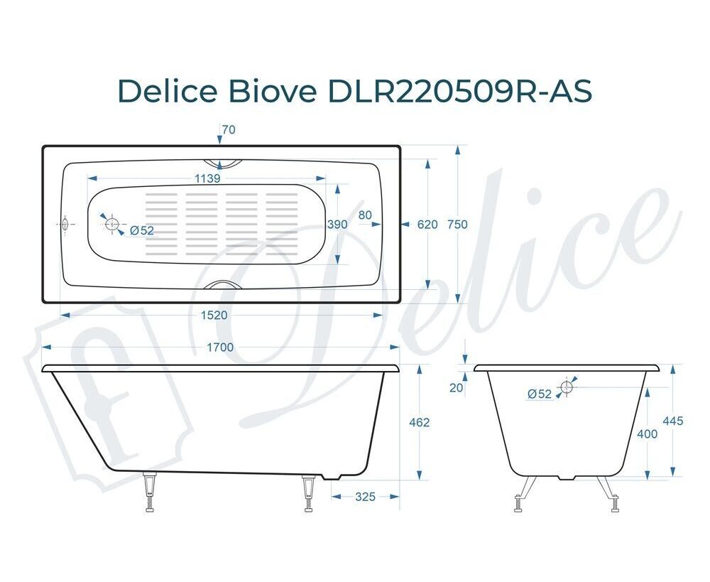 Для установки используются фирменные ножки Delice, которые имеют надежное и прочное крепление, обеспечивают высокую устойчивость ванны и регулируются по высоте. Высота на ножках варьируется от 59.5 до 64.5 см. Ножки выполнены из высокопрочного чугуна марки СЧ25, который выдерживает большие нагрузки. Для модели Biove подходит комплект ножек для серии Comfort.