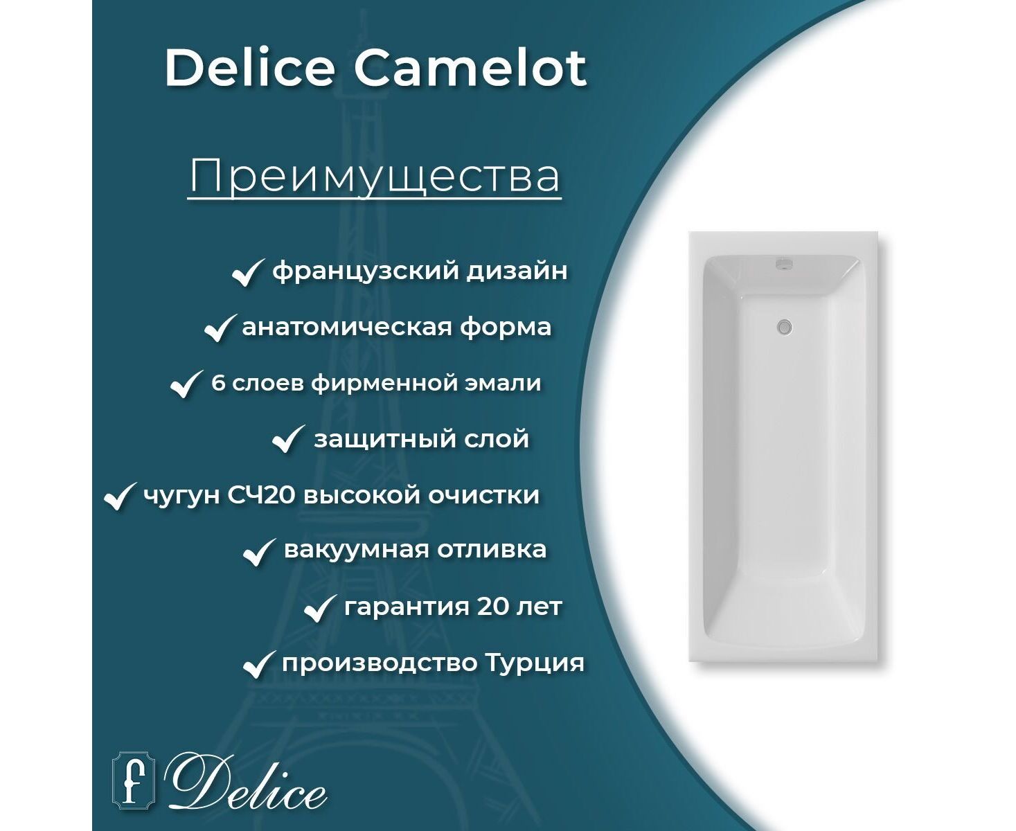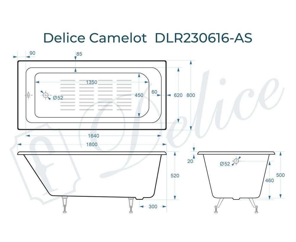 Для установки используются фирменные ножки Delice, которые имеют надежное и прочное крепление, обеспечивают высокую устойчивость ванны и регулируются по высоте. Высота на ножках варьируется от 63 до 67.5 см. Ножки выполнены из высокопрочного чугуна марки СЧ25, который выдерживает большие нагрузки. Для модели Camelot подходит комплект ножек для серии Elite - артикул DLR000002.