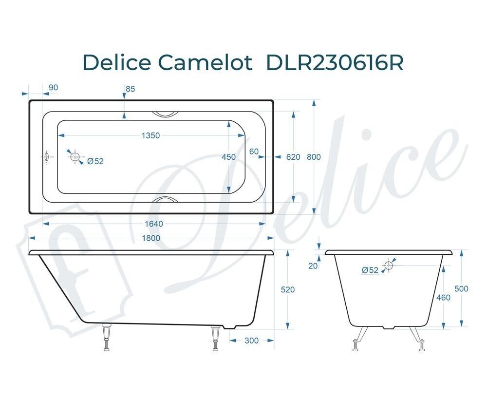 Для установки используются фирменные ножки Delice, которые имеют надежное и прочное крепление, обеспечивают высокую устойчивость ванны и регулируются по высоте. Высота на ножках варьируется от 63 до 67.5 см. Ножки выполнены из высокопрочного чугуна марки СЧ25, который выдерживает большие нагрузки. Для модели Camelot подходит комплект ножек для серии Elite - артикул DLR000002.