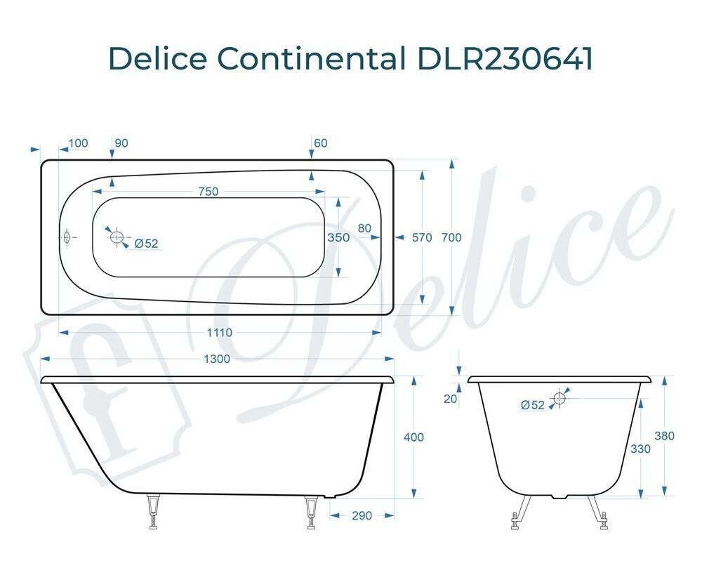 Для установки используются фирменные ножки Delice, которые имеют надежное и прочное крепление, обеспечивают высокую устойчивость ванны и регулируются по высоте. Высота на ножках варьируется от 50 до 58 см. Ножки выполнены из высокопрочного чугуна марки СЧ25, который выдерживает большие нагрузки. Для модели Continental подходит комплект ножек для серии Elite - артикул DLR000033.