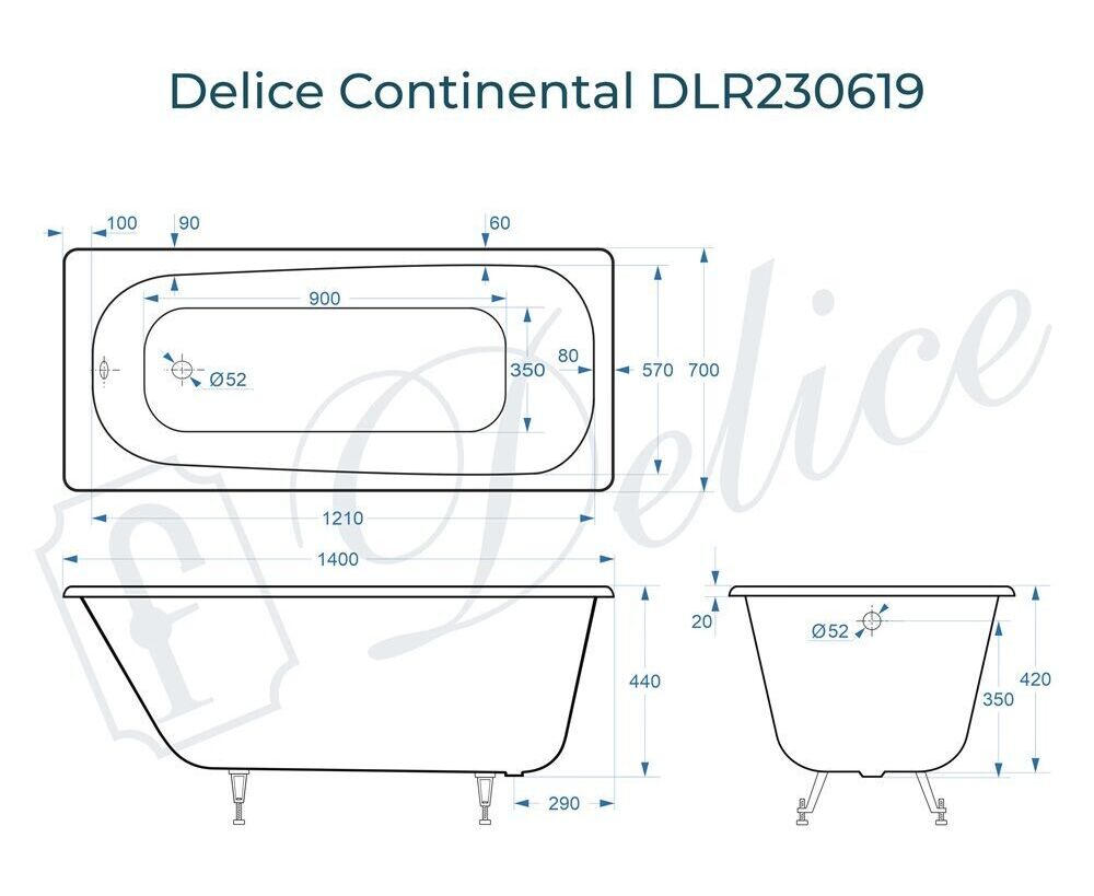 Для установки используются фирменные ножки Delice, которые имеют надежное и прочное крепление, обеспечивают высокую устойчивость ванны и регулируются по высоте. Высота на ножках варьируется от 55 до 61 см. Ножки выполнены из высокопрочного чугуна марки СЧ25, который выдерживает большие нагрузки. Для модели Continental подходит комплект ножек для серии Elite - артикул DLR000033.