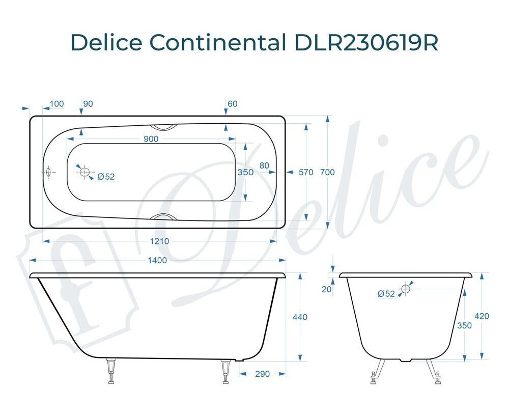 Для установки используются фирменные ножки Delice, которые имеют надежное и прочное крепление, обеспечивают высокую устойчивость ванны и регулируются по высоте. Высота на ножках варьируется от 55 до 61 см. Ножки выполнены из высокопрочного чугуна марки СЧ25, который выдерживает большие нагрузки. Для модели Continental подходит комплект ножек для серии Elite - артикул DLR000033.