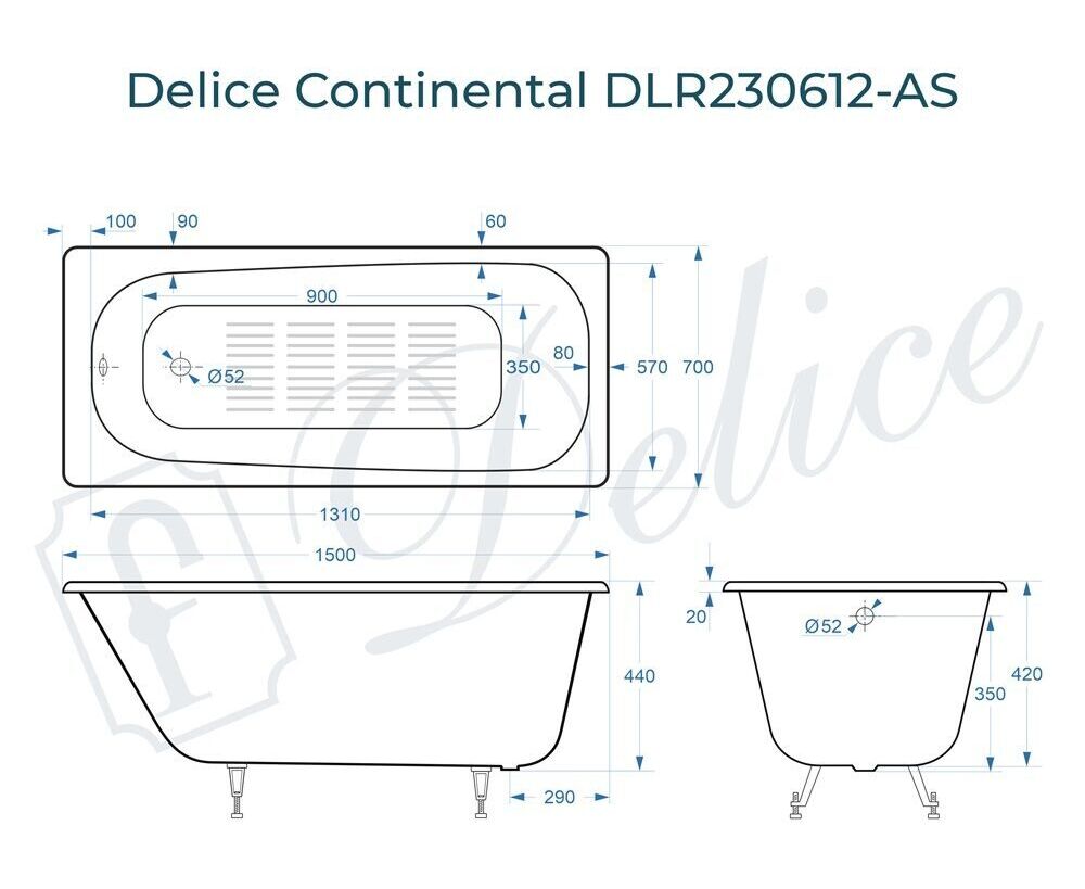 Для установки используются фирменные ножки Delice, которые имеют надежное и прочное крепление, обеспечивают высокую устойчивость ванны и регулируются по высоте. Высота на ножках варьируется от 55 до 61 см. Ножки выполнены из высокопрочного чугуна марки СЧ25, который выдерживает большие нагрузки. Для модели Continental подходит комплект ножек для серии Elite - артикул DLR000033.