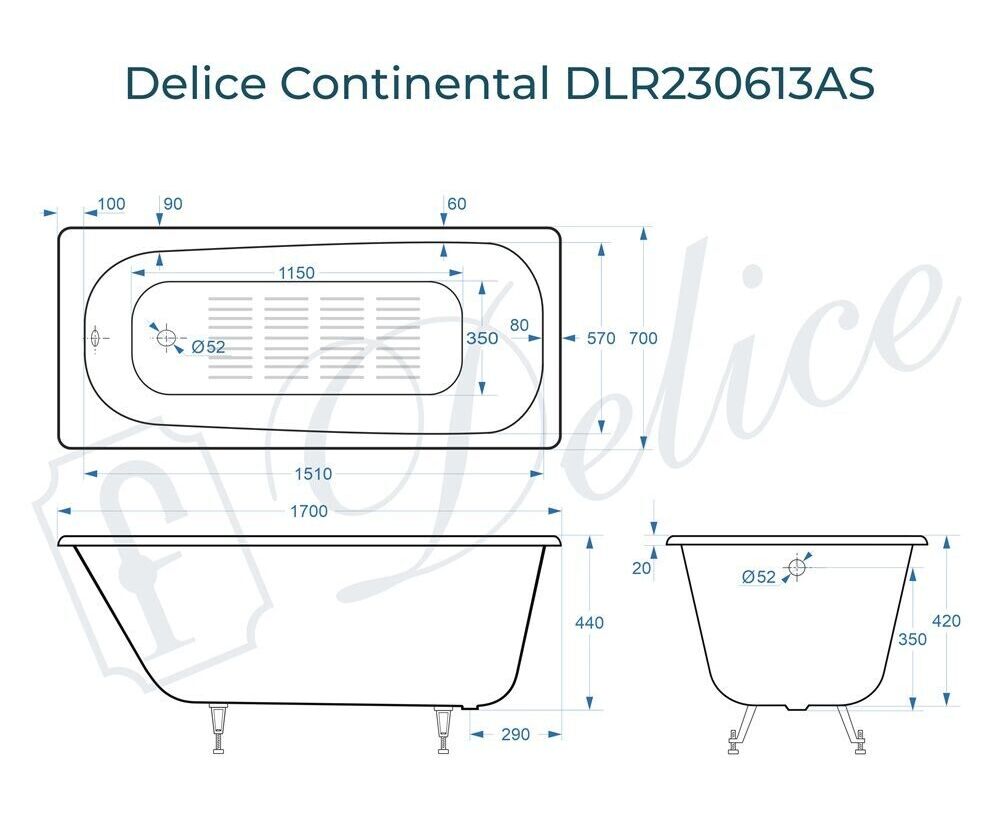 Для установки используются фирменные ножки Delice, которые имеют надежное и прочное крепление, обеспечивают высокую устойчивость ванны и регулируются по высоте. Высота на ножках варьируется от 55 до 61 см. Ножки выполнены из высокопрочного чугуна марки СЧ25, который выдерживает большие нагрузки. Для модели Continental подходит комплект ножек для серии Elite - артикул DLR000033.