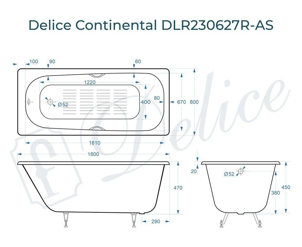 Для установки используются фирменные ножки Delice, которые имеют надежное и прочное крепление, обеспечивают высокую устойчивость ванны и регулируются по высоте. Высота на ножках варьируется от 58 до 65 см. Ножки выполнены из высокопрочного чугуна марки СЧ25, который выдерживает большие нагрузки. Для модели Continental подходит комплект ножек для серии Elite - артикул DLR000033.