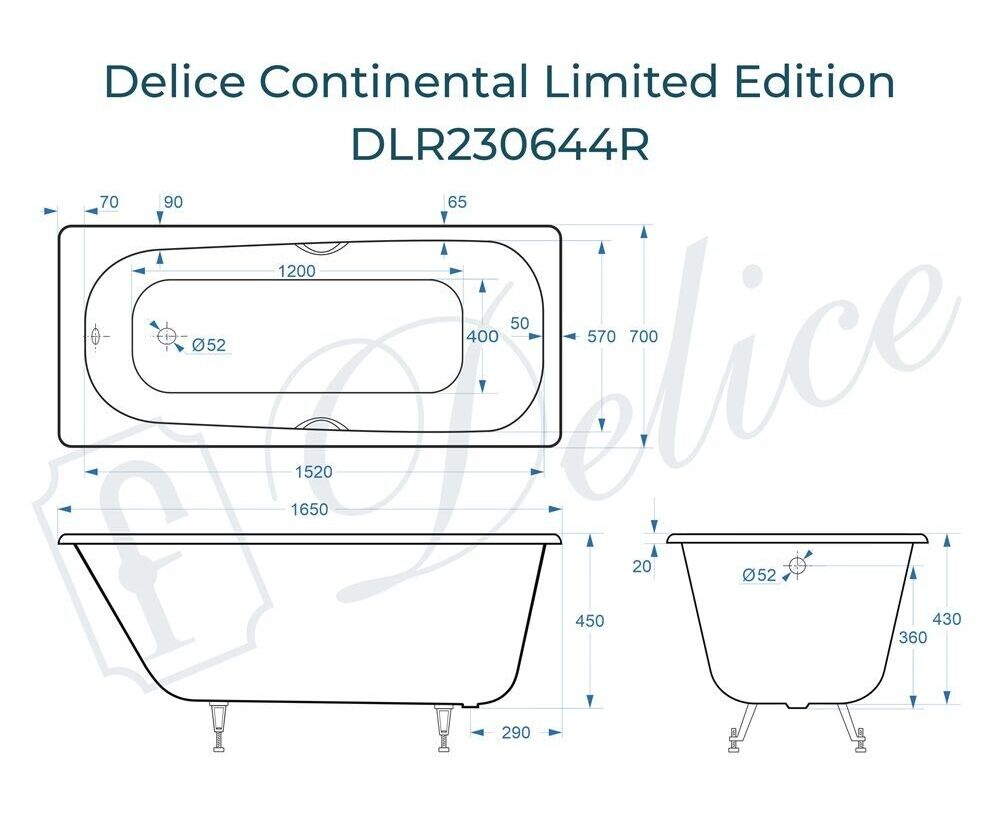 Размерный ряд чугунной ванны Delice Continental Limited Edition: 165х70 см.