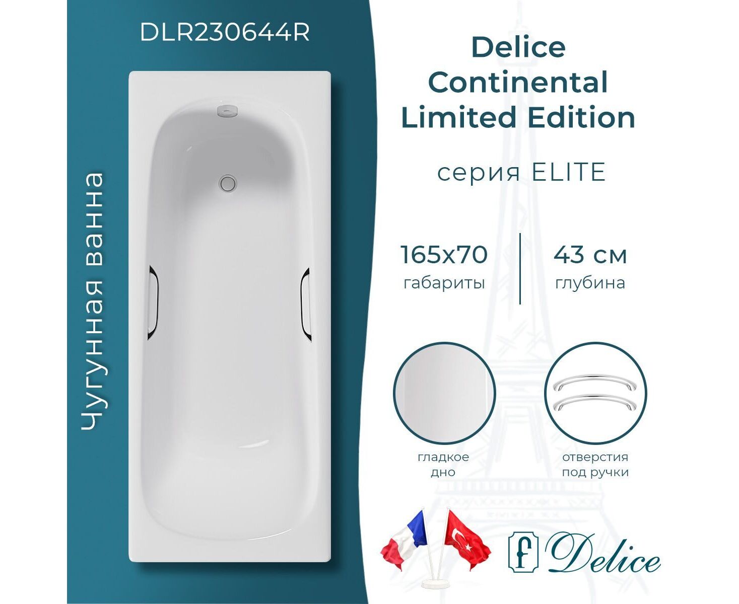 Delice Continental 165х70 Limited Edition с отверстиями под ручки - лимитированная версия топовой чугунной ванны Continental. Выполнена в редком размере длиной 165 см и стандартной шириной 70 см. Дизайн ванны спроектирован на классической основе с улучшенными характеристиками: овальное дно, плавный переход от дна к стенкам, анатомическая спинка, увеличенная глубина 43 см, округлая внутренняя форма. Continental Limited Edition - стильная комфортная ванна, которая станет прекрасным элементом интерьера.