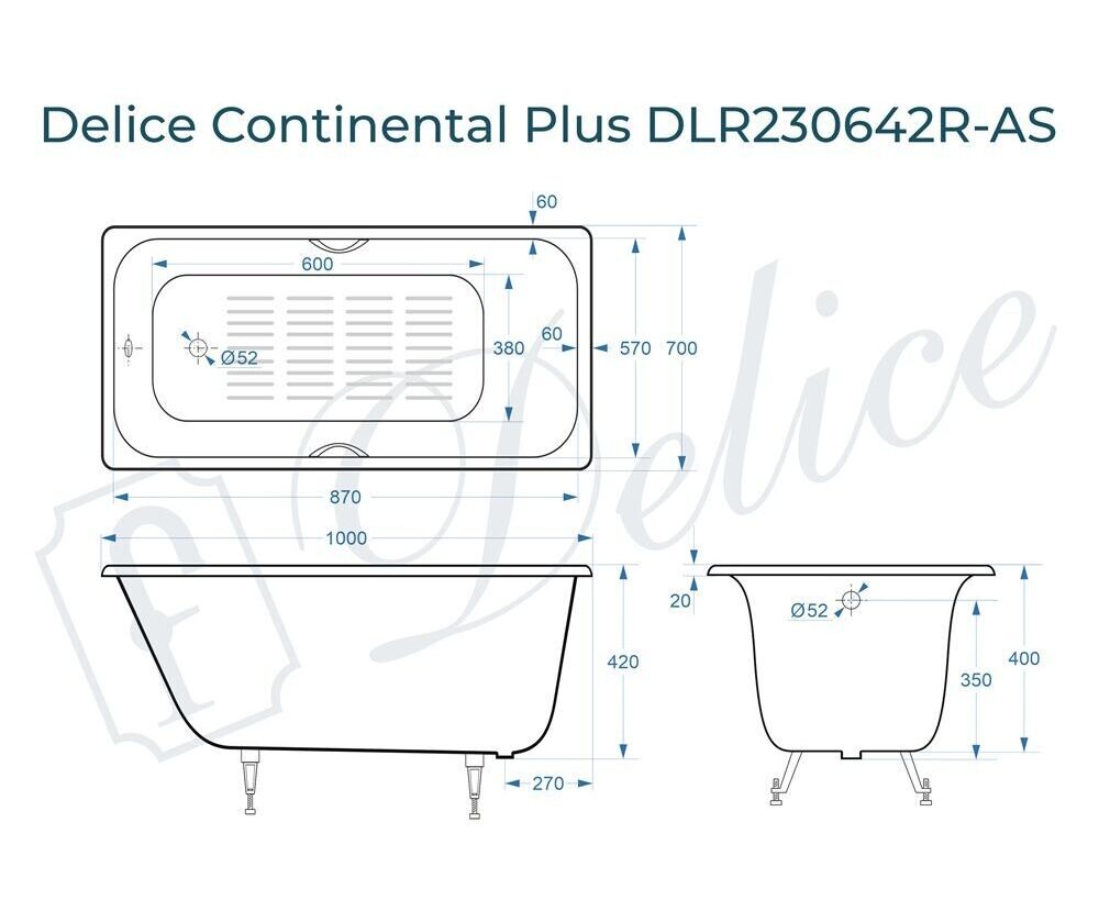 Для установки используются фирменные ножки Delice, которые имеют надежное и прочное крепление, обеспечивают высокую устойчивость ванны и регулируются по высоте. Высота на ножках варьируется от 52 до 60 см. Ножки выполнены из высокопрочного чугуна марки СЧ25, который выдерживает большие нагрузки. Для модели Continental PLUS подходит комплект ножек для серии Elite - артикул DLR000033.
