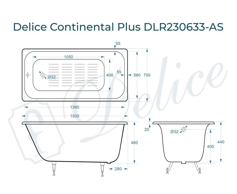 Для установки используются фирменные ножки Delice, которые имеют надежное и прочное крепление, обеспечивают высокую устойчивость ванны и регулируются по высоте. Высота на ножках варьируется от 57 до 65 см. Ножки выполнены из высокопрочного чугуна марки СЧ25, который выдерживает большие нагрузки. Для модели Continental PLUS подходит комплект ножек для серии Elite - артикул DLR000033.