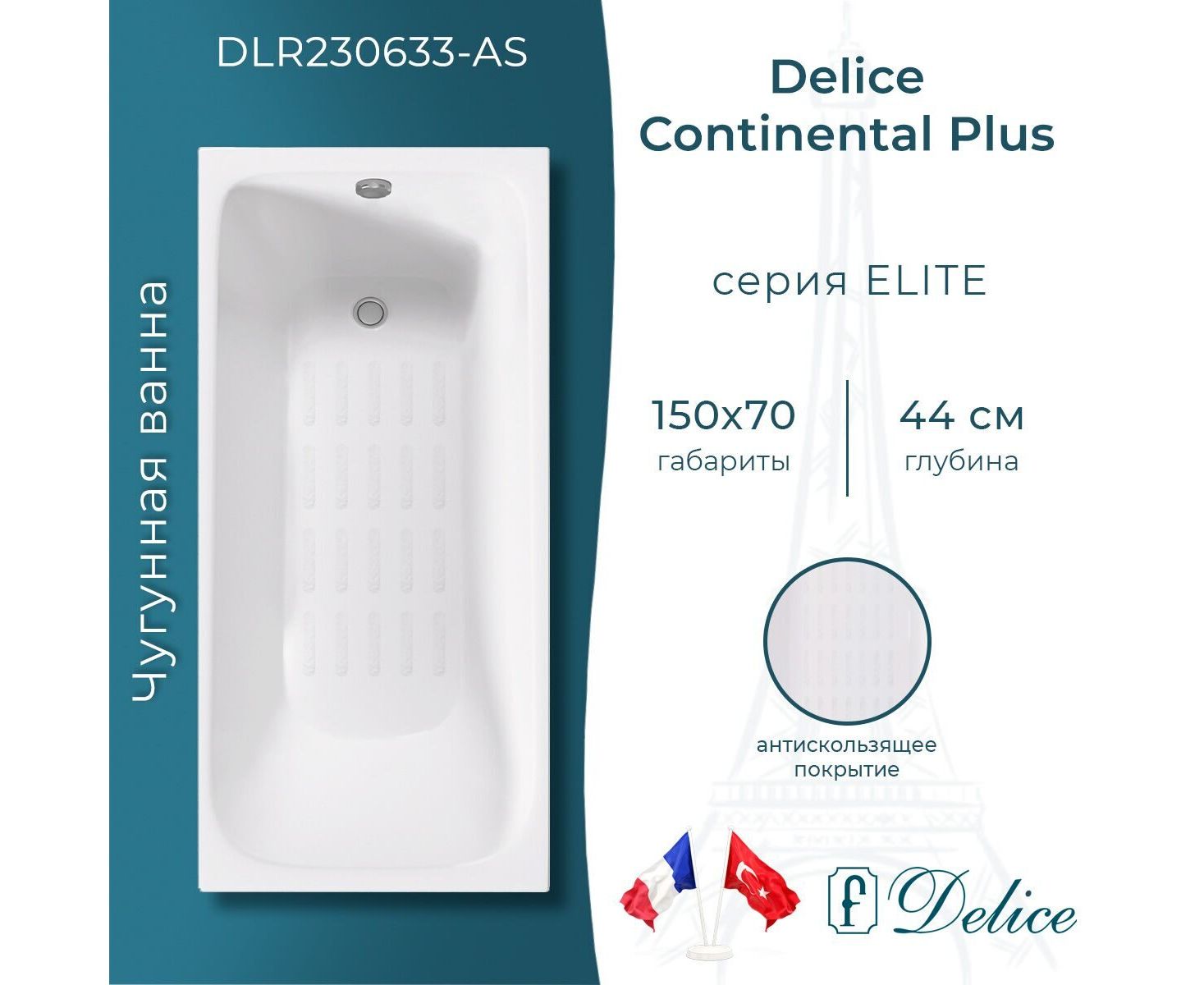 Характеристики Ванна чугунная Delice Continental PLUS 150х70 с антискользящим покрытием DLR230633-AS