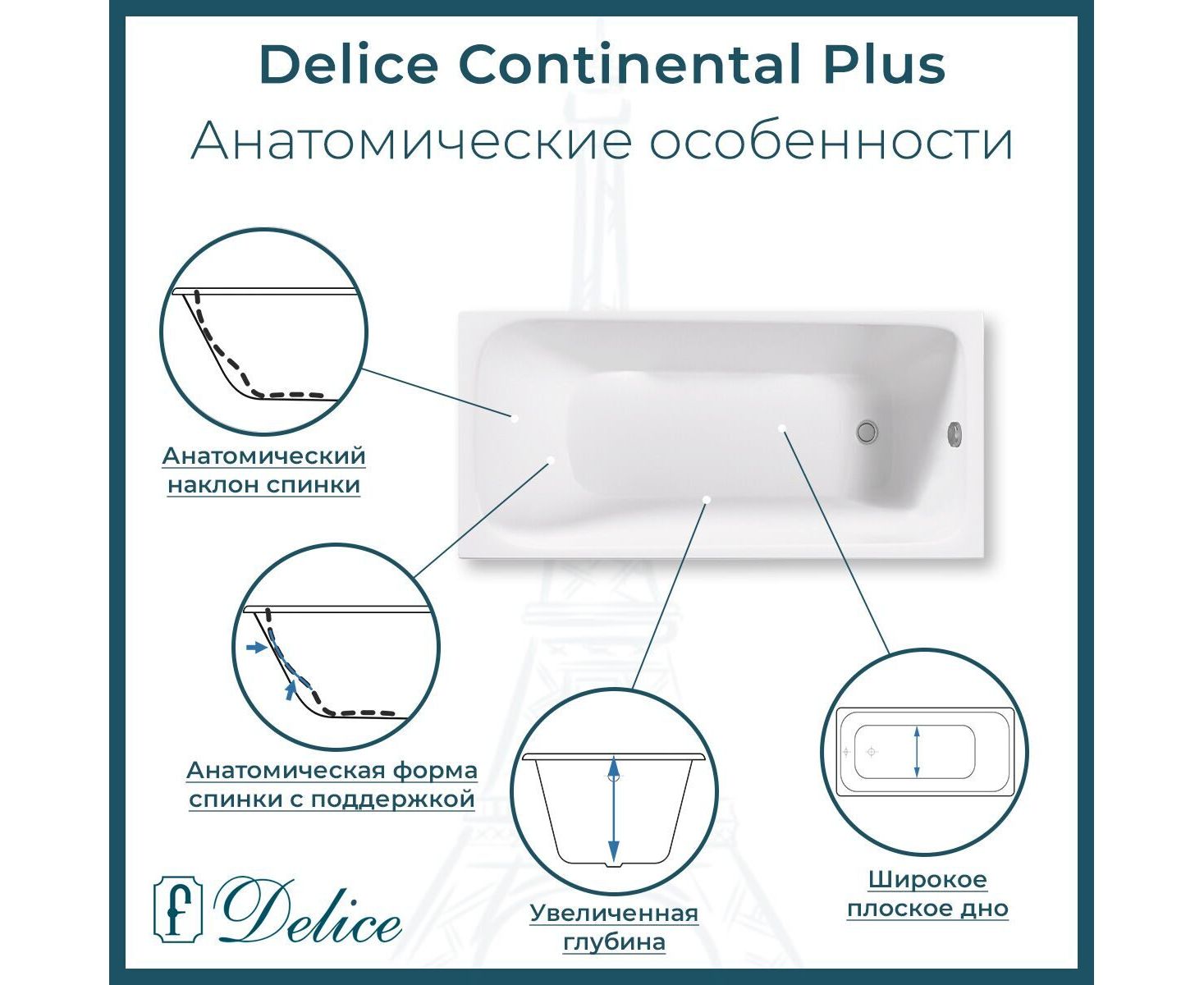 Данная модификация Delice Continental PLUS имеет противоскользящее покрытие дна, которое гарантирует безопасный и комфортный прием ванны и душа. Покрытие наносится специальным оборудованием на производстве в виде тонких полос, практически не заметно визуально и не ощущается при использовании.