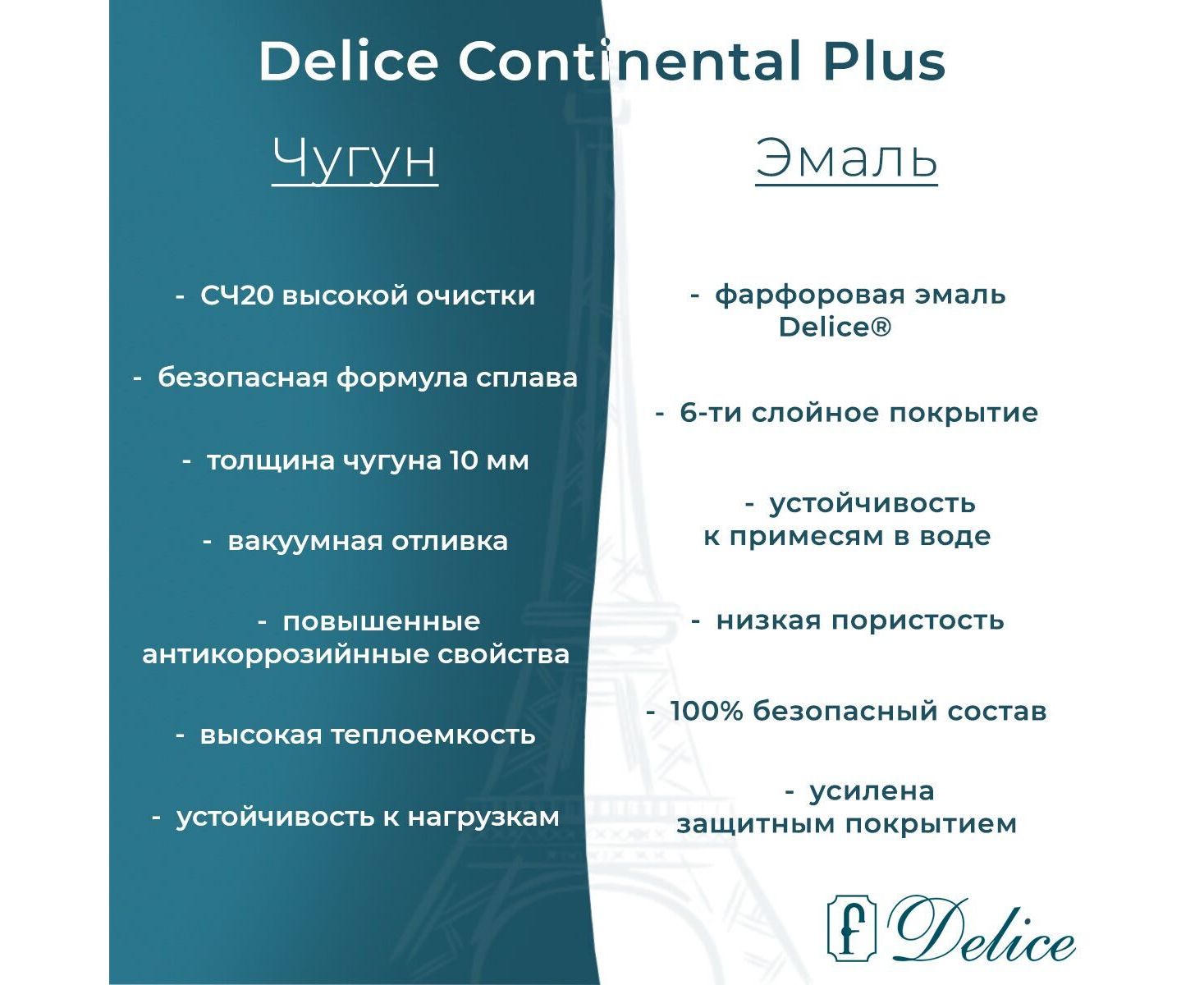 Все наши ванны покрыты уникальной фирменной эмалью Delice, произведенной по разработанной компанией формуле, которая имеет уникальные эксплуатационные характеристики. Формула эмали разрабатывалась специально для нанесения многослойного покрытия на чугунные ванны.