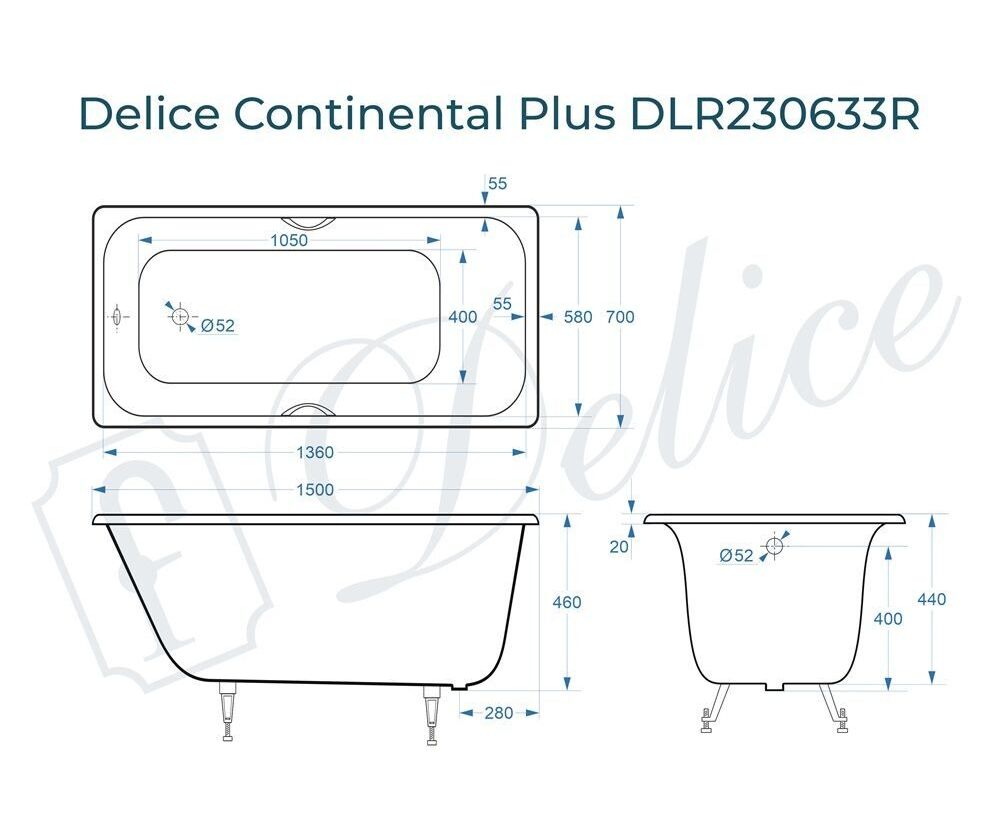 Delice Continental PLUS 150х70 с отверстиями под ручки - максимально комфортная модель чугунной ванны, созданная для тех, кто любит полежать в ванной. Она обладает улучшенными характеристиками: увеличенный внутренний объем, широкое плоское дно, расширенная чаша и анатомическая спинка. Наши дизайнеры разработали идеальную модель для вашего дома. Классический дизайн будет выигрышно смотреться в ванной комнате в любом стиле интерьера. Размер 150х70 подойдет для установки в небольшом помещении.
