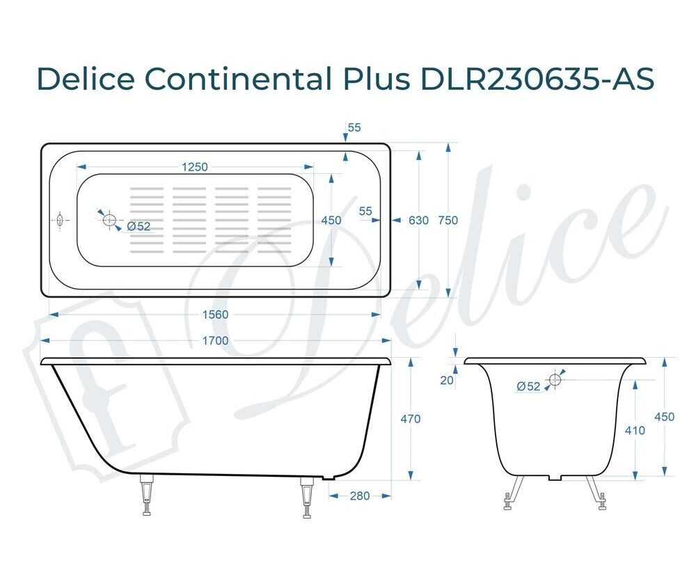 Для установки используются фирменные ножки Delice, которые имеют надежное и прочное крепление, обеспечивают высокую устойчивость ванны и регулируются по высоте. Высота на ножках варьируется от 58 до 66 см. Ножки выполнены из высокопрочного чугуна марки СЧ25, который выдерживает большие нагрузки. Для модели Continental PLUS подходит комплект ножек для серии Elite - артикул DLR000033.