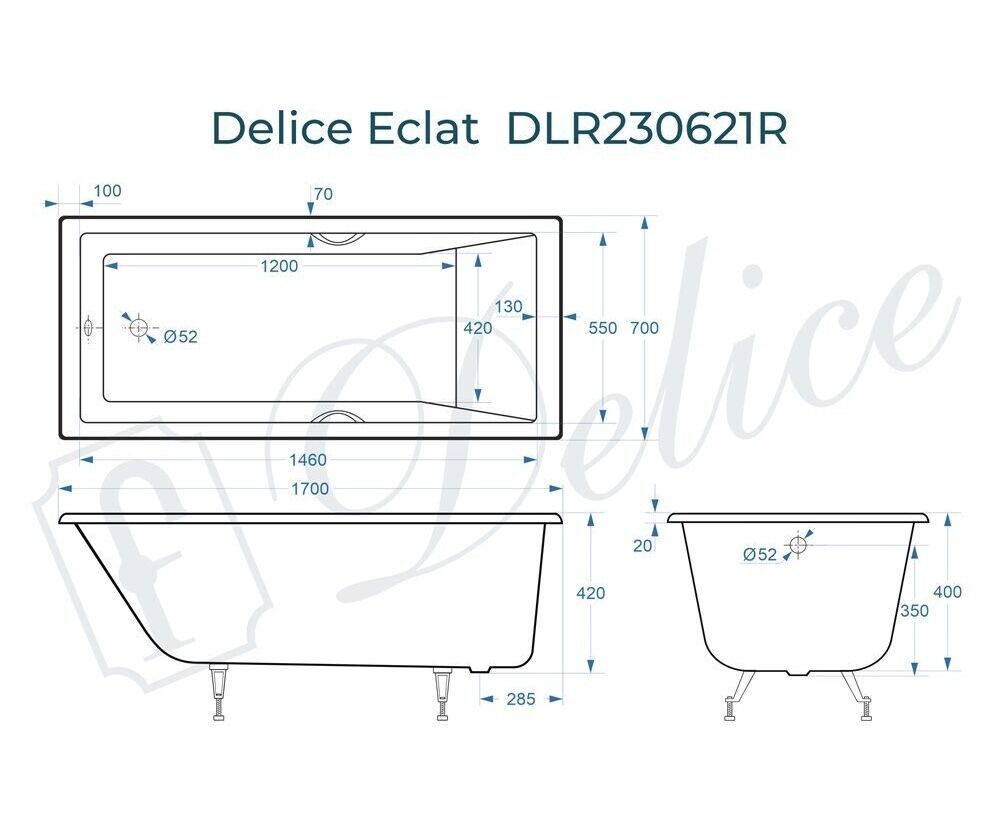 Для установки используются фирменные ножки Delice, которые имеют надежное и прочное крепление, обеспечивают высокую устойчивость ванны и регулируются по высоте. Высота на ножках варьируется от 55 до 59.5 см. Ножки выполнены из высокопрочного чугуна марки СЧ25, который выдерживает большие нагрузки. Для модели Eclat подходит комплект ножек для серии Elite - артикул DLR000002.