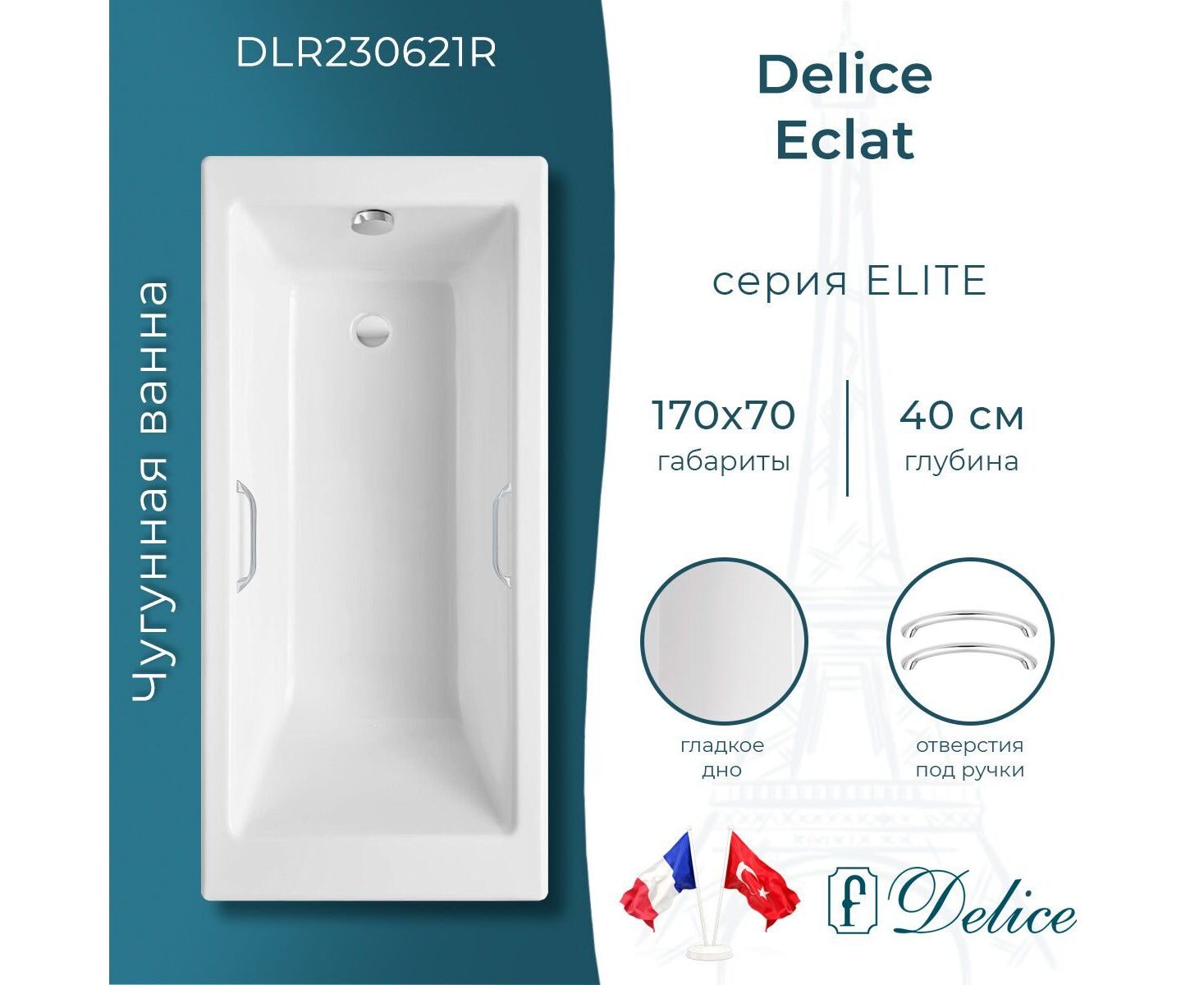 Ультрасовременная чугунная ванна Delice Eclat 170x70 см с отверстиями под ручки - отличное решение для модных и стильных интерьеров. Дизайн ванны по-своему уникальный и отличается правильными геометрическими линиями, которые создают неповторимую внутреннюю форму ванны. Модель Эклат станет отличным дополнением ванной комнаты в стиле лофт, минимализм, модерн и в любом современном стиле. Анатомическая форма чаши обеспечивает комфортное и удобное расположение в ванне.