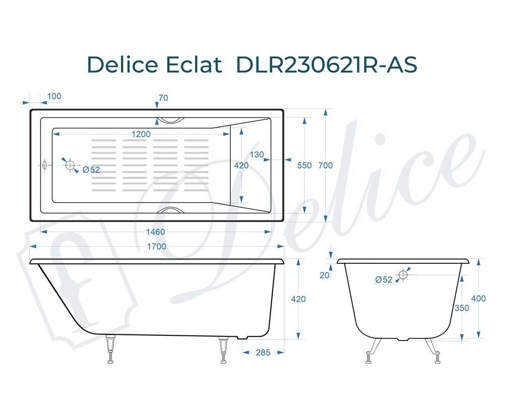Для установки используются фирменные ножки Delice, которые имеют надежное и прочное крепление, обеспечивают высокую устойчивость ванны и регулируются по высоте. Высота на ножках варьируется от 55 до 59.5 см. Ножки выполнены из высокопрочного чугуна марки СЧ25, который выдерживает большие нагрузки. Для модели Eclat подходит комплект ножек для серии Elite - артикул DLR000002.
