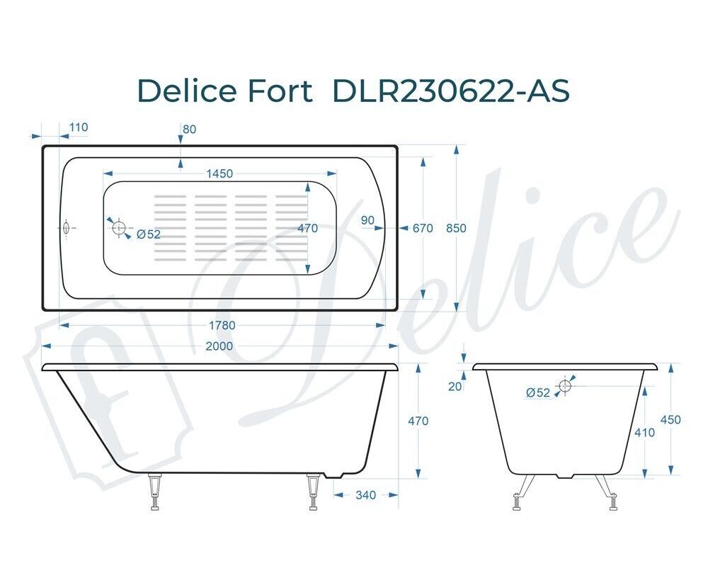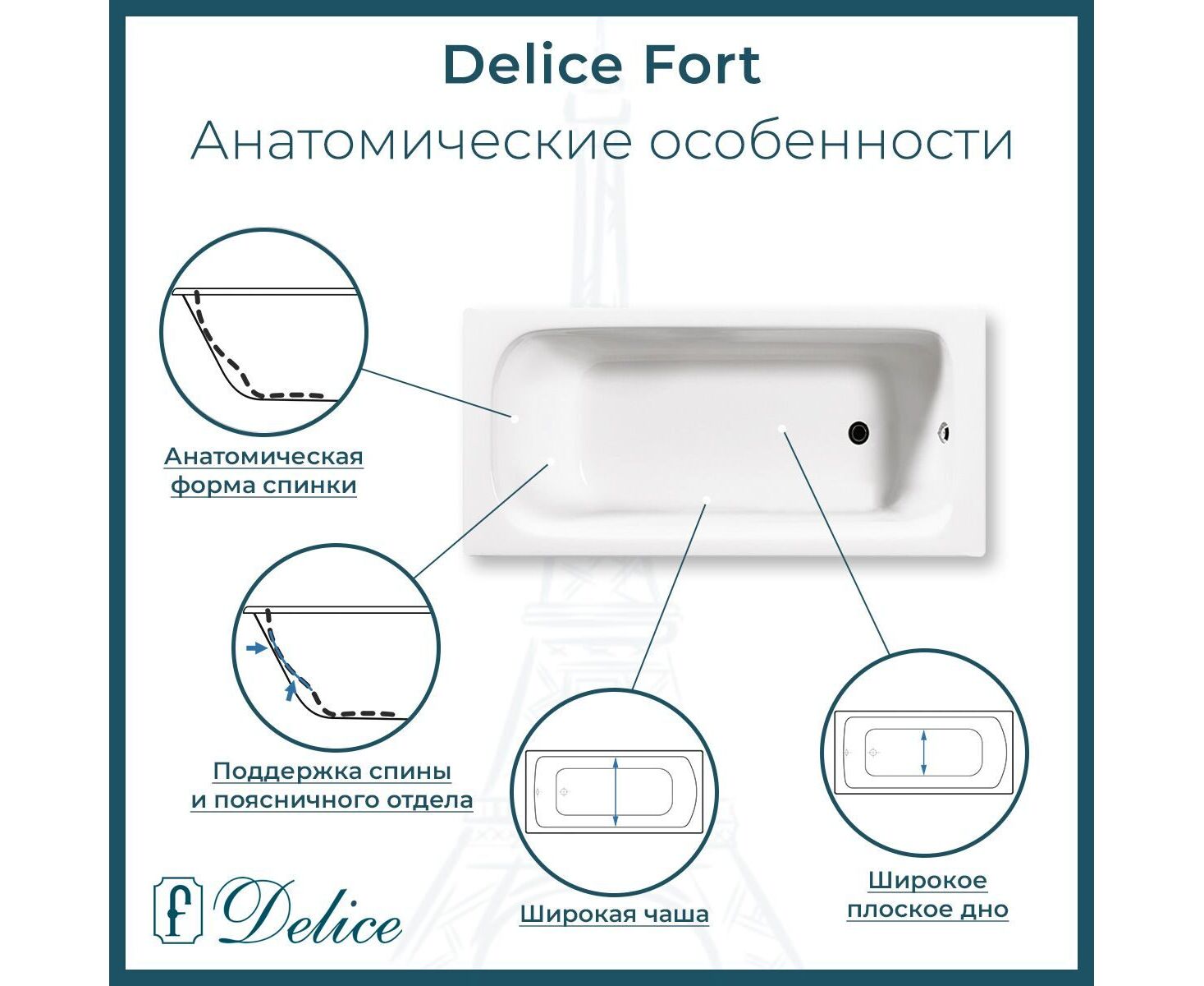 Для установки используются фирменные ножки Delice, которые имеют надежное и прочное крепление, обеспечивают высокую устойчивость ванны и регулируются по высоте. Высота на ножках варьируется от 59 до 63.5 см. Ножки выполнены из высокопрочного чугуна марки СЧ25, который выдерживает большие нагрузки. Для модели Fort подходит комплект ножек для серии Elite - артикул DLR000033.