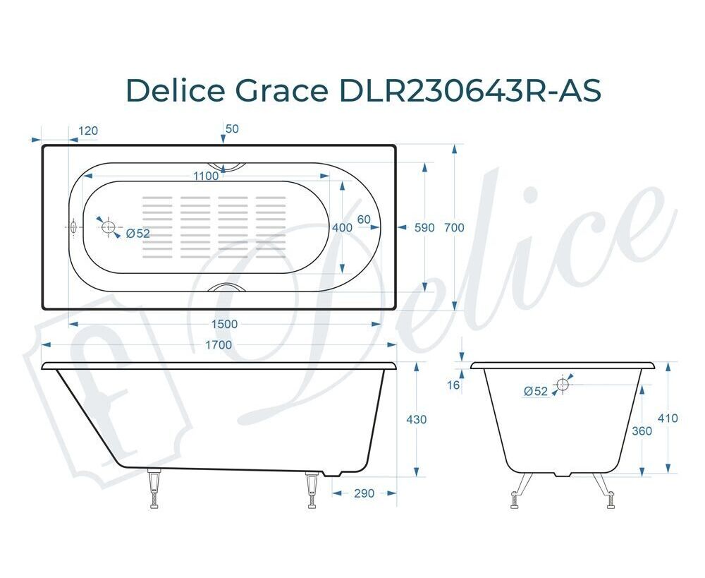 Размерный ряд чугунной ванны Delice Grace: 170х70 см.