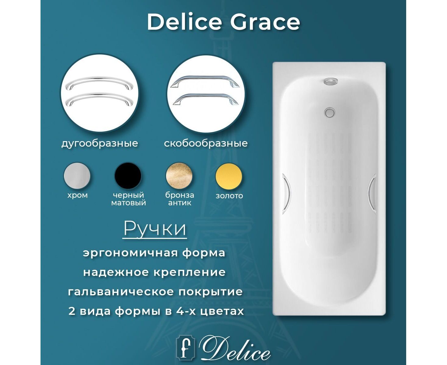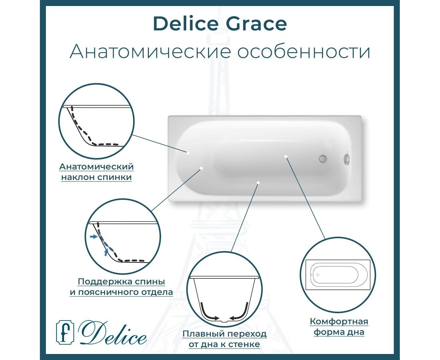 Для установки используются фирменные ножки Delice, которые имеют надежное и прочное крепление, обеспечивают высокую устойчивость ванны и регулируются по высоте. Высота на ножках варьируется от 54 до 58 см. Ножки выполнены из высокопрочного чугуна марки СЧ25, который выдерживает большие нагрузки. Для модели Grace подходит комплект ножек для серии Elite - артикул DLR000002.