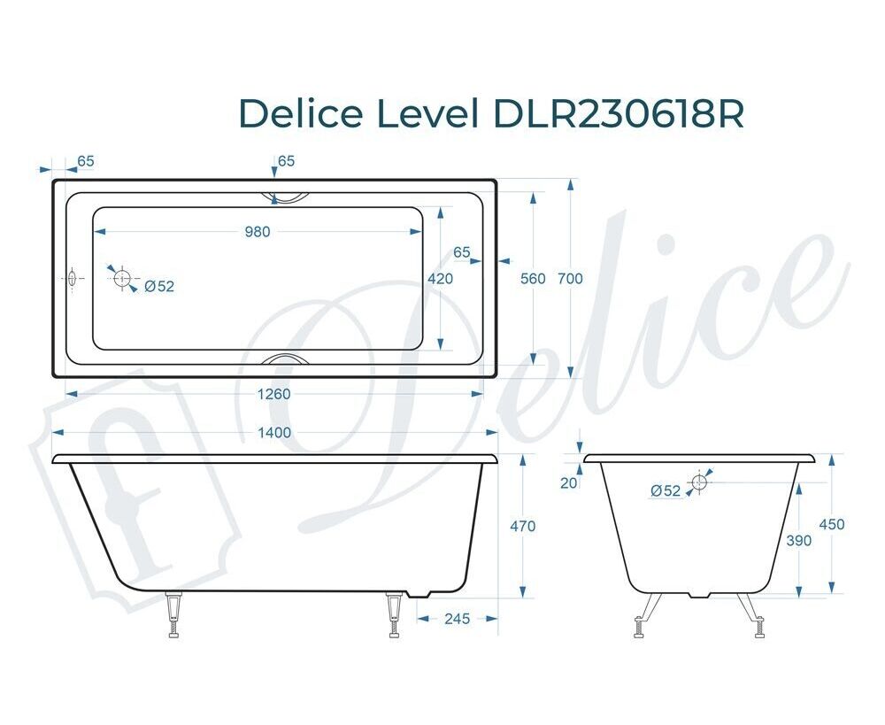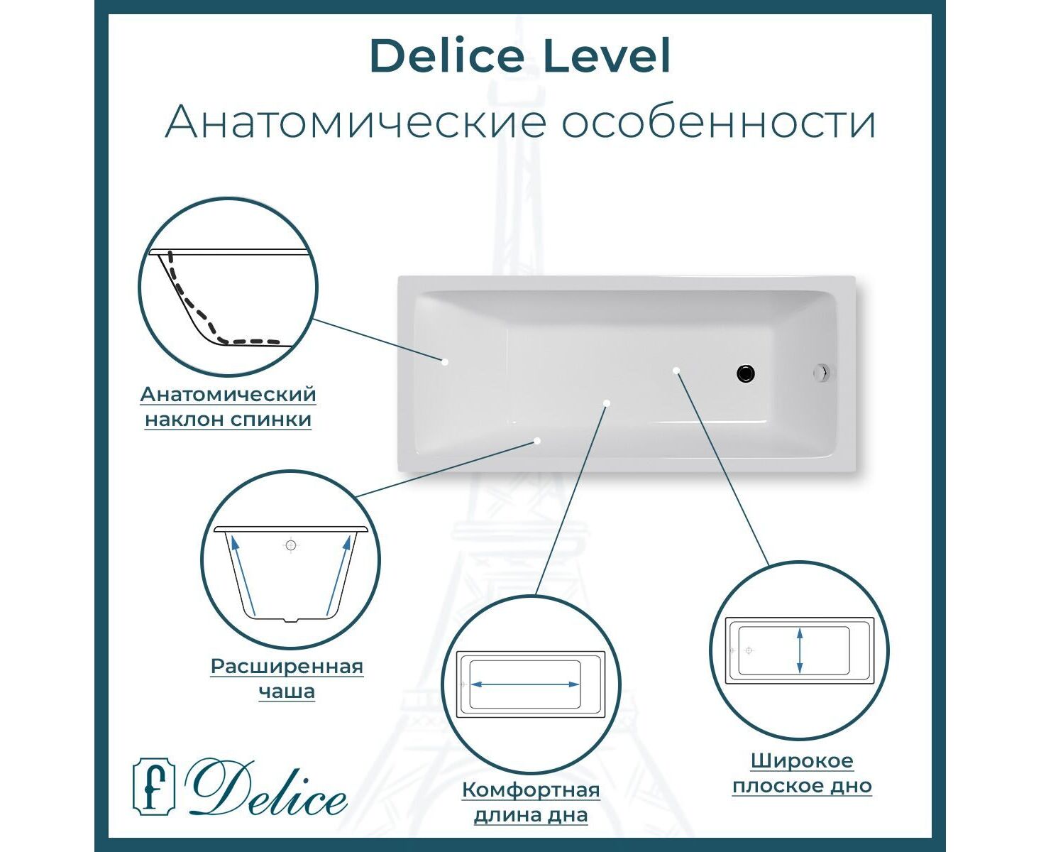 Для установки используются фирменные ножки Delice, которые имеют надежное и прочное крепление, обеспечивают высокую устойчивость ванны и регулируются по высоте. Высота на ножках варьируется от 58 до 62.5 см. Ножки выполнены из высокопрочного чугуна марки СЧ25, который выдерживает большие нагрузки. С помощью регулировки можно нивелировать геометрические отклонения пола, стен и углов в ванной комнате. Для модели Level подходит комплект ножек для серии Elite - артикул DLR000002.