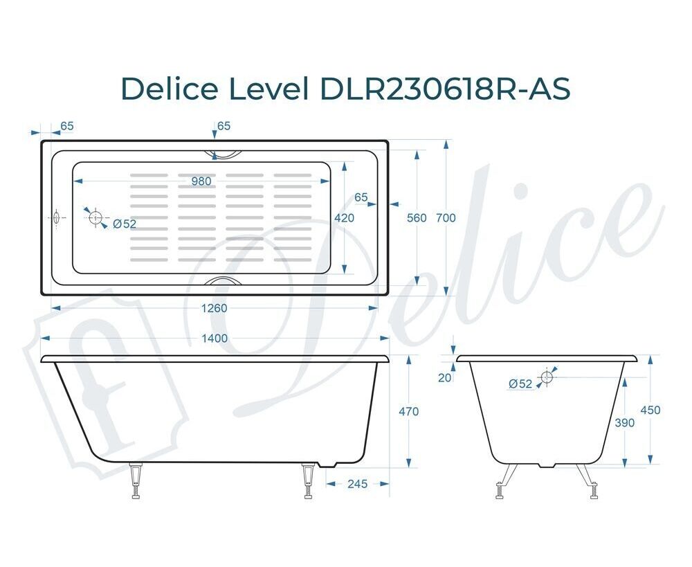 Для установки используются фирменные ножки Delice, которые имеют надежное и прочное крепление, обеспечивают высокую устойчивость ванны и регулируются по высоте. Высота на ножках варьируется от 58 до 62.5 см. Ножки выполнены из высокопрочного чугуна марки СЧ25, который выдерживает большие нагрузки. С помощью регулировки можно нивелировать геометрические отклонения пола, стен и углов в ванной комнате. Для модели Level подходит комплект ножек для серии Elite - артикул DLR000002.