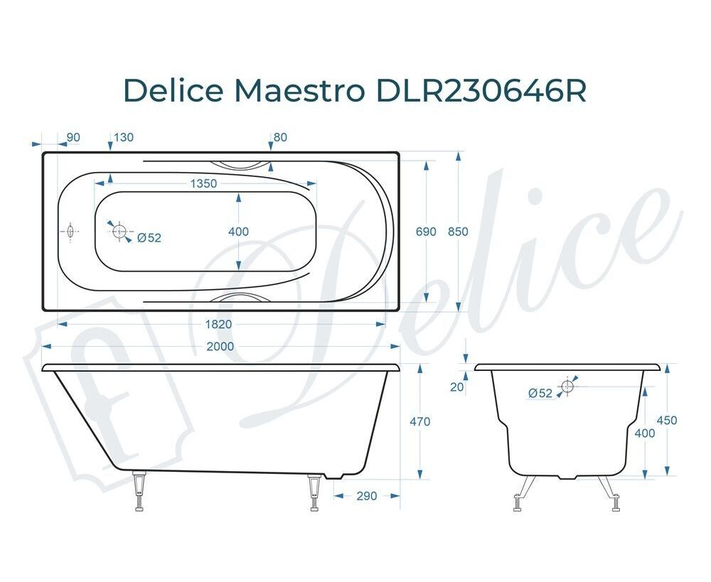 Характеристики Ванна чугунная Delice Maestro 200х85 с отверстиями под ручки DLR230646R