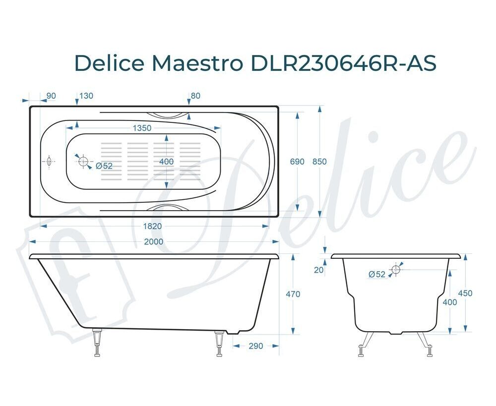 Описание чугунной ванны Delice Maestro 200х85 с отверстиями под ручки и антискользящим покрытием