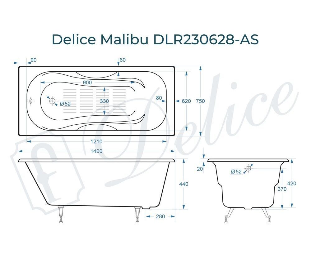 Для установки используются фирменные ножки Delice, которые имеют надежное и прочное крепление, обеспечивают высокую устойчивость ванны и регулируются по высоте. Высота на ножках варьируется от 55 до 59.5 см. Ножки выполнены из высокопрочного чугуна марки СЧ25, который выдерживает большие нагрузки. С помощью регулировки можно нивелировать геометрические отклонения пола, стен и углов в ванной комнате. Для модели Malibu подходит комплект ножек для серии Elite - артикул DLR000033.