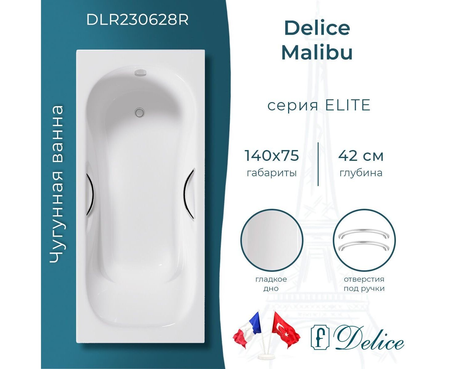 Характеристики Ванна чугунная Delice Malibu 140х75 с отверстиями под ручки DLR230628R