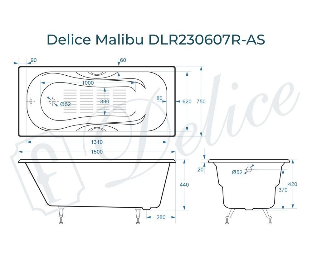 Для установки используются фирменные ножки Delice, которые имеют надежное и прочное крепление, обеспечивают высокую устойчивость ванны и регулируются по высоте. Высота на ножках варьируется от 55 до 59.5 см. Ножки выполнены из высокопрочного чугуна марки СЧ25, который выдерживает большие нагрузки. С помощью регулировки можно нивелировать геометрические отклонения пола, стен и углов в ванной комнате. Для модели Malibu подходит комплект ножек для серии Elite - артикул DLR000033.